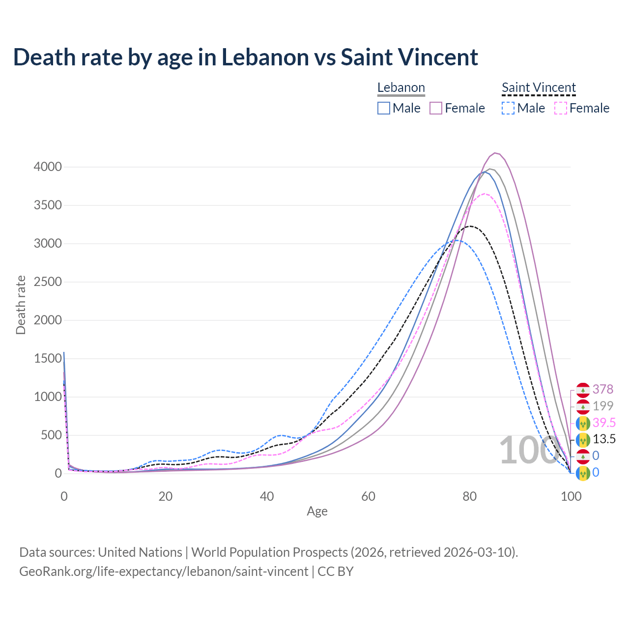 In Lebanon, the most common age of death is 84, compared to 80 in Saint Vincent. The median age of death is 81.6 in Lebanon and 75.6 in Saint Vincent, meaning only half of each cohort is expected to live past that age.