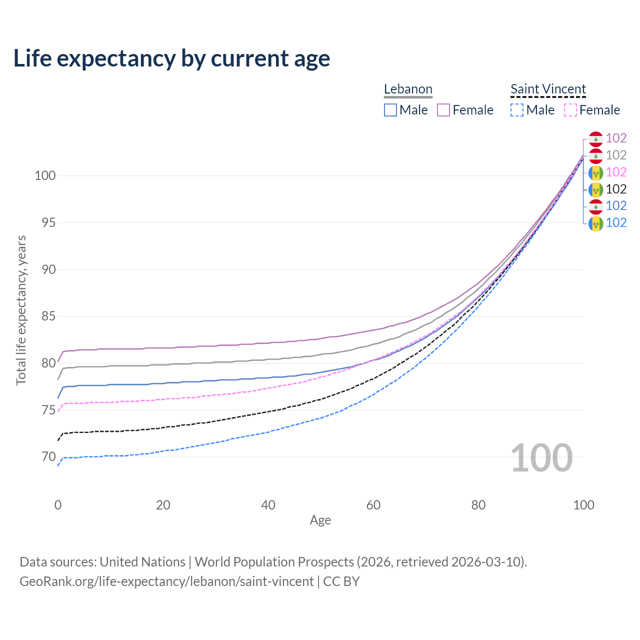 This life expectancy calculator shows the odds of living to 100, 95, 90, and below based on current age for both males and females in Lebanon and Saint Vincent, along with mean and median age of death. The calculations are based on the 2026 life tables (actuarial tables) from the UN World Population Prospects.