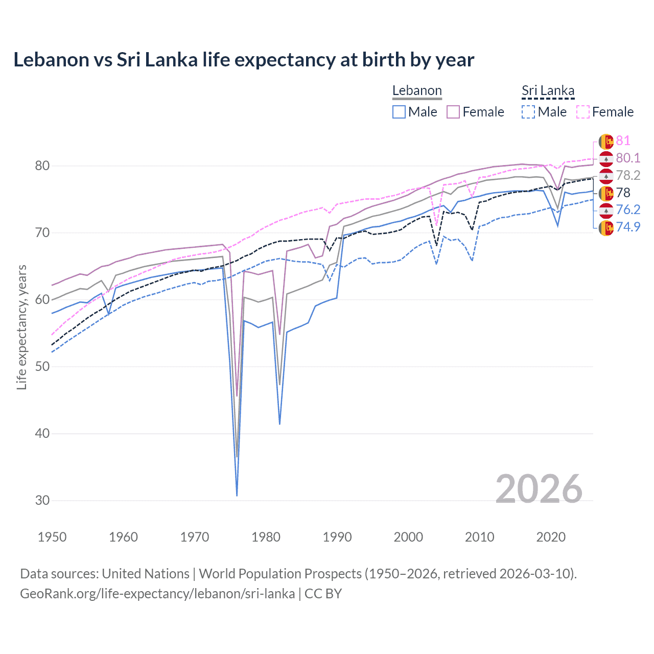 The average life expectancy at birth is 78.2 years in Lebanon vs 78 in Sri Lanka. Lebanon is ranked 62/197 by life expectancy, and Sri Lanka is 64/197. In Lebanon, the life expectancy is 76.2 years for males and 80.1 years for females. In Sri Lanka, it's 74.9 years for males and 81 years for females.