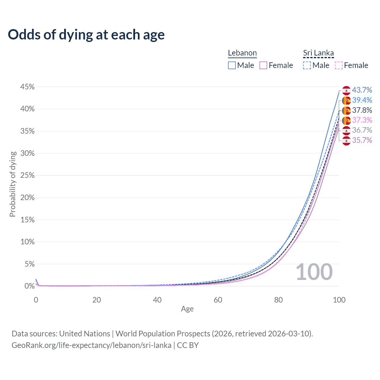 This life expectancy calculator shows the odds of living to 100, 95, 90, and below based on current age for both males and females in Lebanon and Sri Lanka, along with mean and median age of death. The calculations are based on the 2026 life tables (actuarial tables) from the UN World Population Prospects.