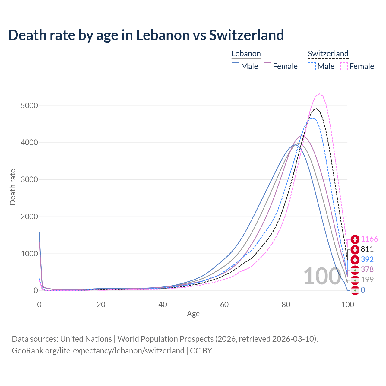 This life expectancy calculator shows the odds of living to 100, 95, 90, and below based on current age for both males and females in Lebanon and Switzerland, along with mean and median age of death. The calculations are based on the 2026 life tables (actuarial tables) from the UN World Population Prospects.
