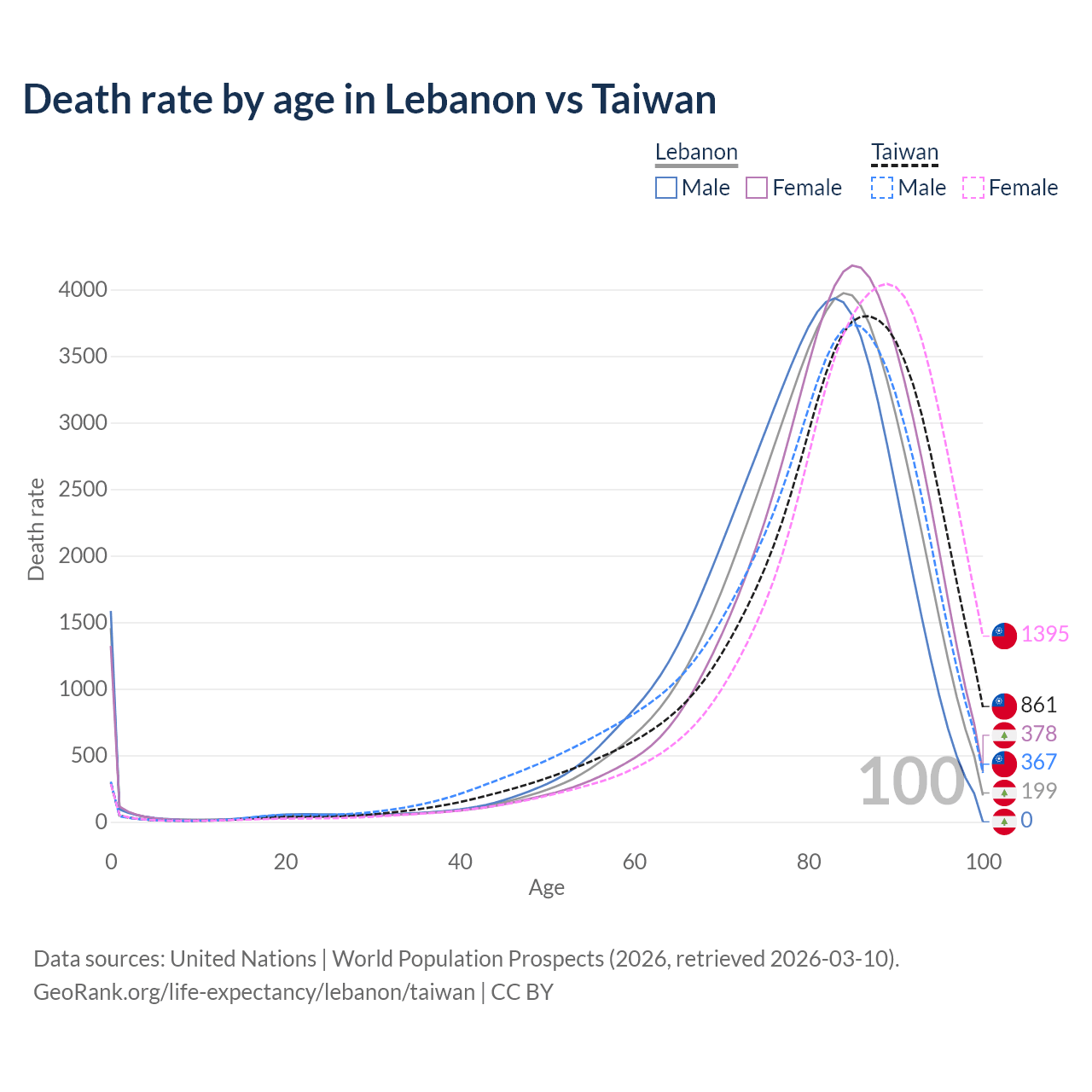 In Lebanon, the most common age of death is 84, compared to 87 in Taiwan. The median age of death is 81.6 in Lebanon and 84.3 in Taiwan, meaning only half of each cohort is expected to live past that age.