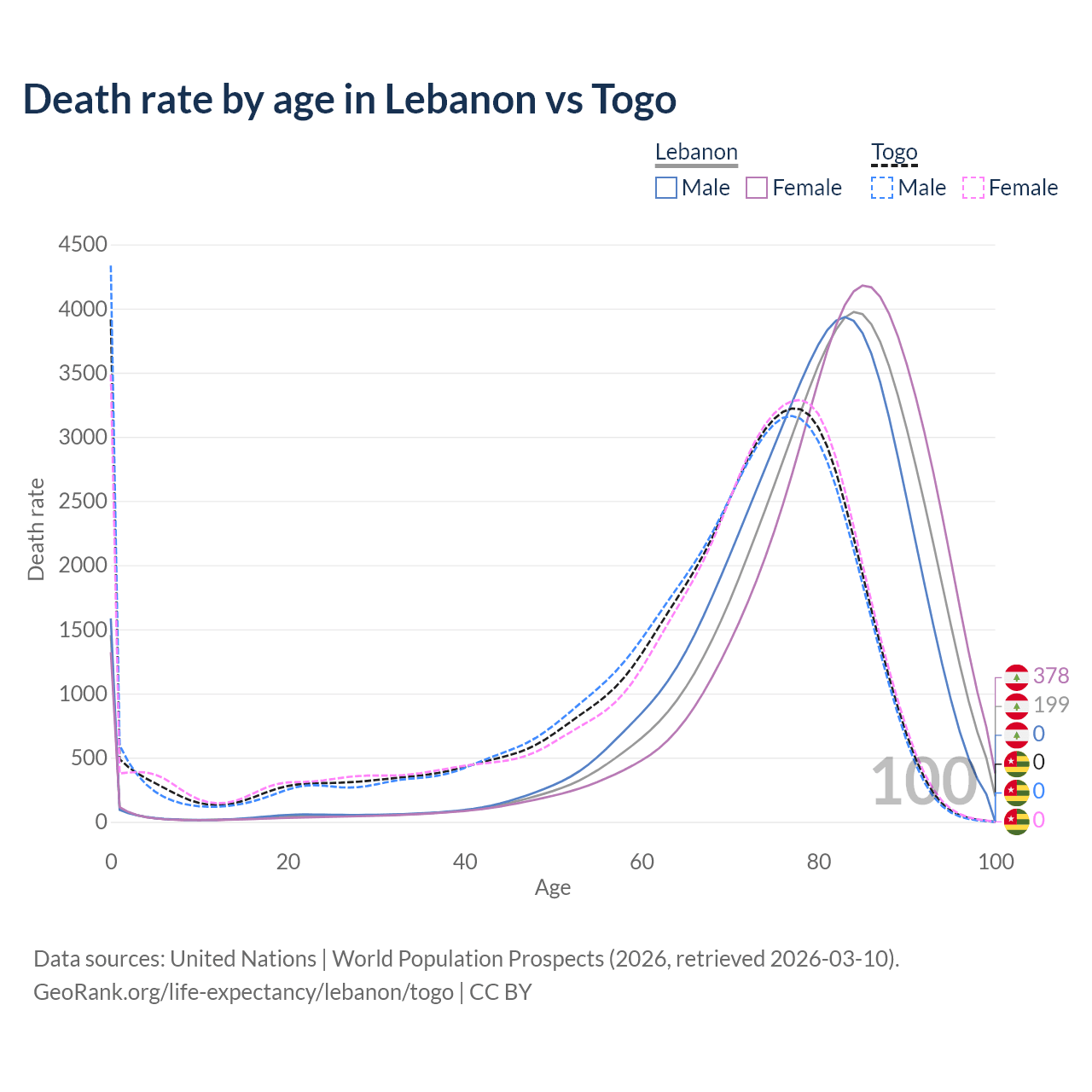 In Lebanon, the most common age of death is 84, compared to 0 in Togo. The median age of death is 81.6 in Lebanon and 71 in Togo, meaning only half of each cohort is expected to live past that age.