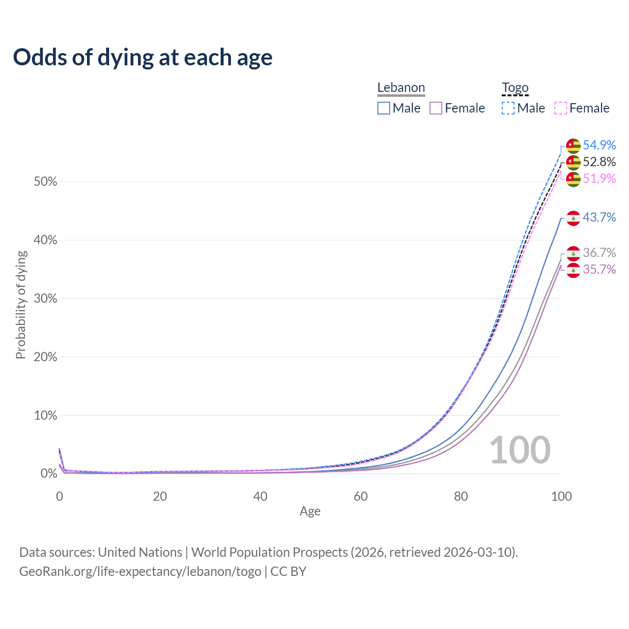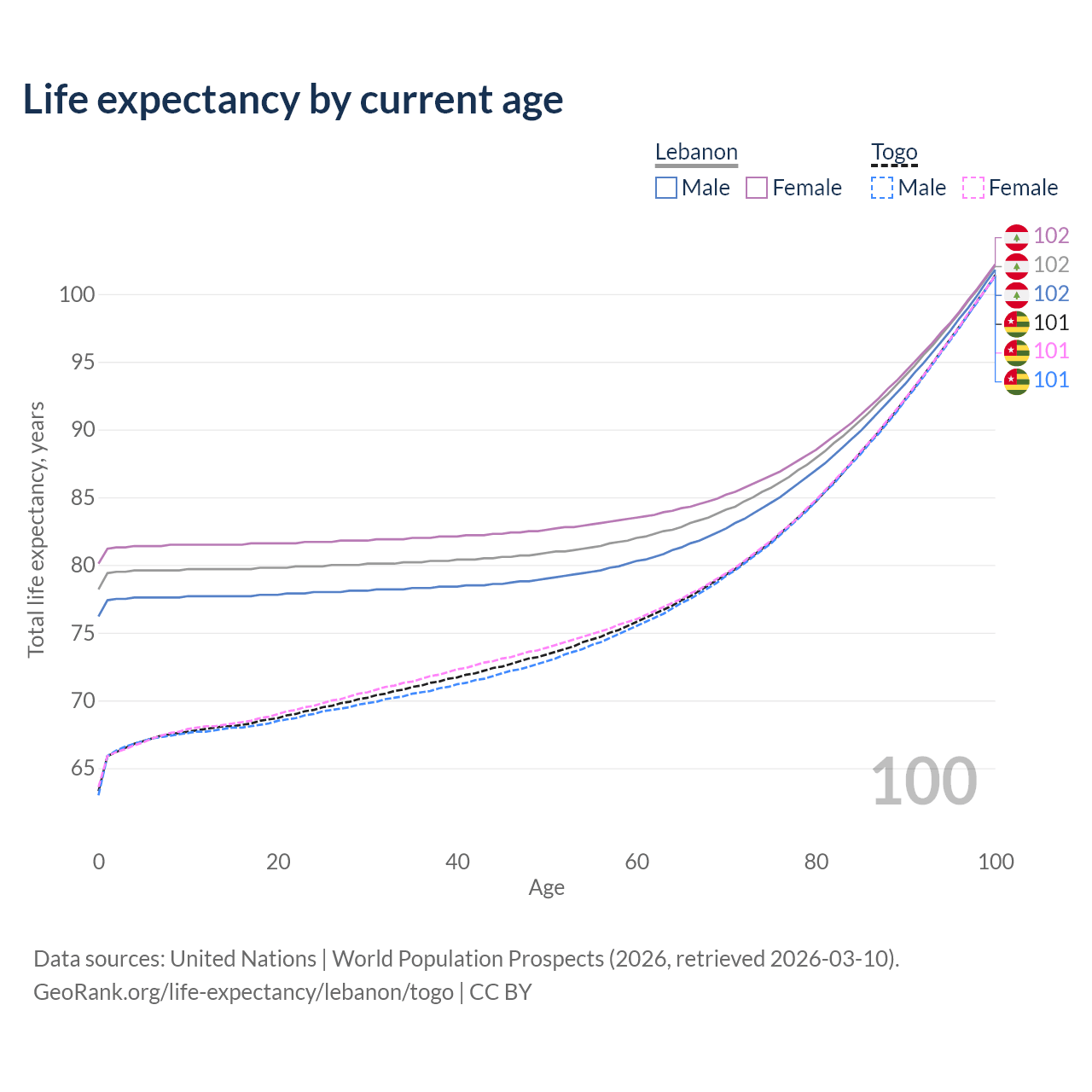 This life expectancy calculator shows the odds of living to 100, 95, 90, and below based on current age for both males and females in Lebanon and Togo, along with mean and median age of death. The calculations are based on the 2026 life tables (actuarial tables) from the UN World Population Prospects.