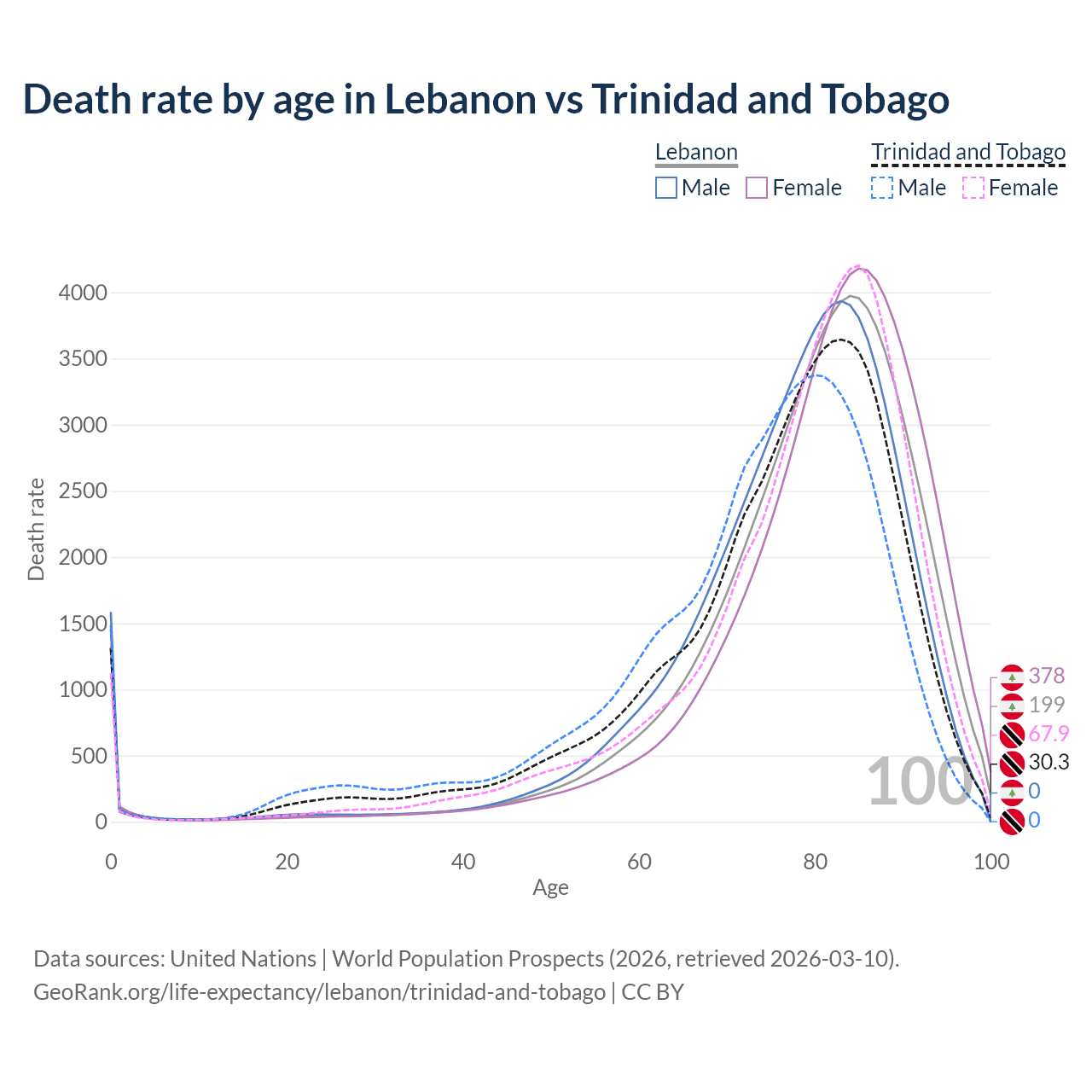 In Lebanon, the most common age of death is 84, compared to 83 in Trinidad and Tobago. The median age of death is 81.6 in Lebanon and 78.4 in Trinidad and Tobago, meaning only half of each cohort is expected to live past that age.