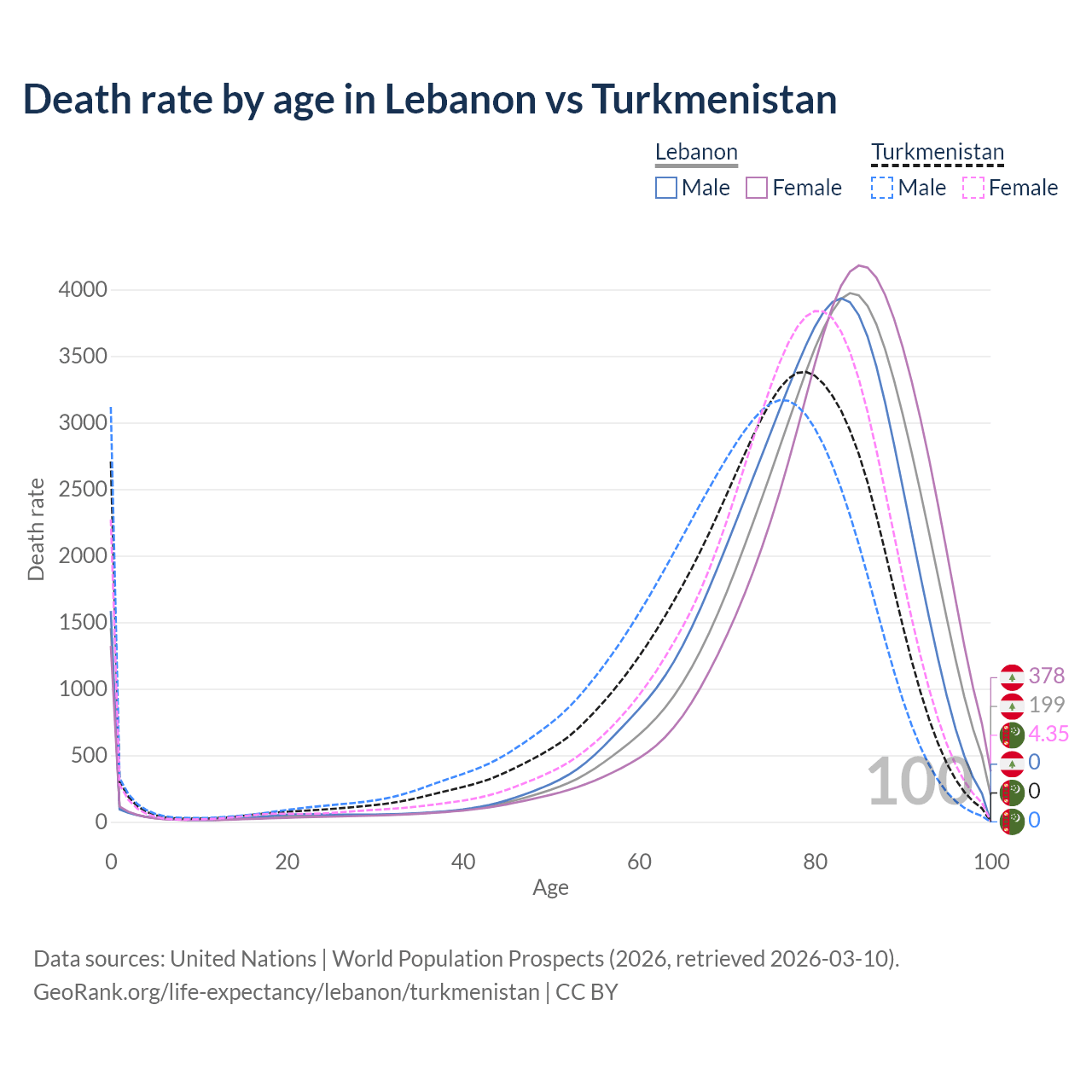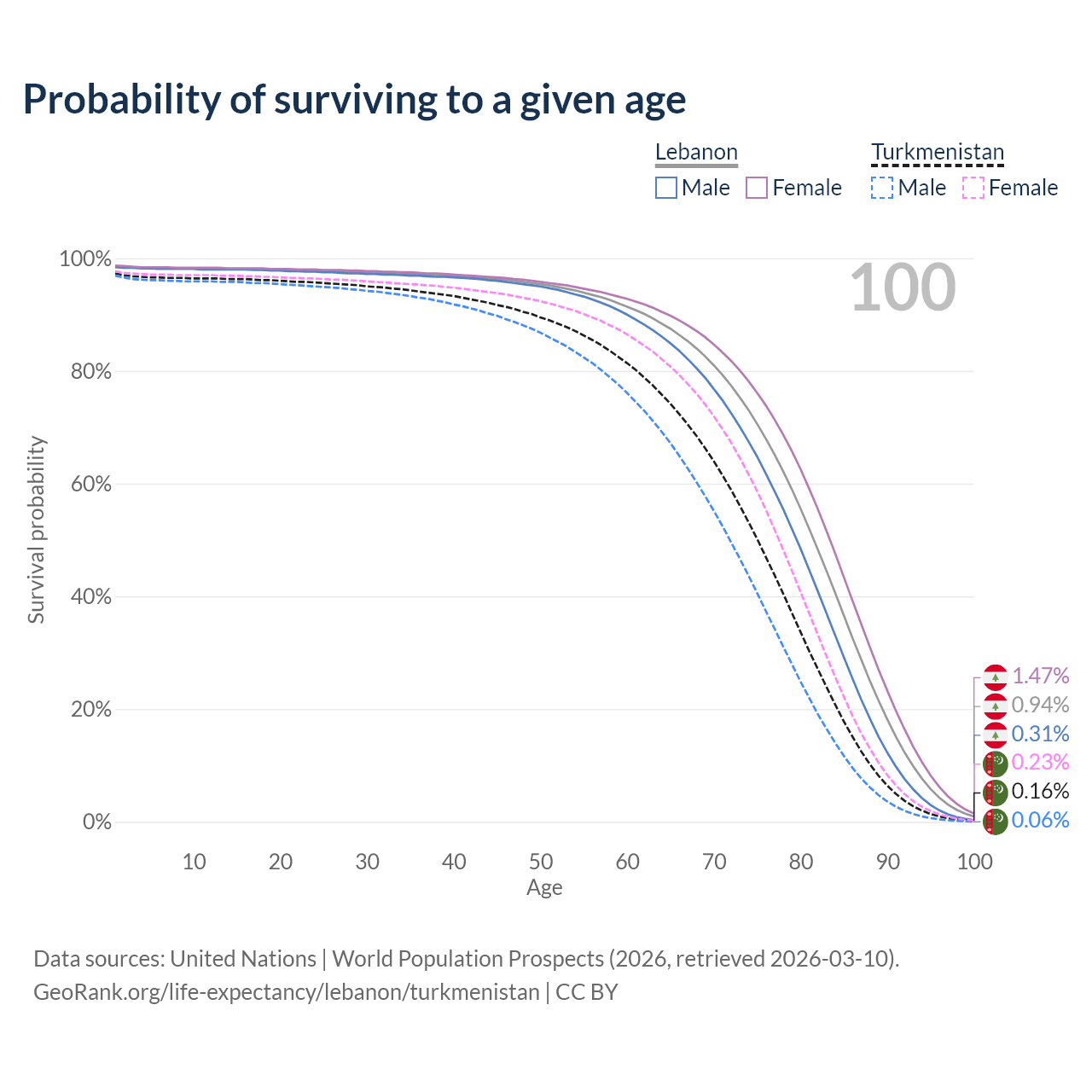 This life expectancy calculator shows the odds of living to 100, 95, 90, and below based on current age for both males and females in Lebanon and Turkmenistan, along with mean and median age of death. The calculations are based on the 2026 life tables (actuarial tables) from the UN World Population Prospects.