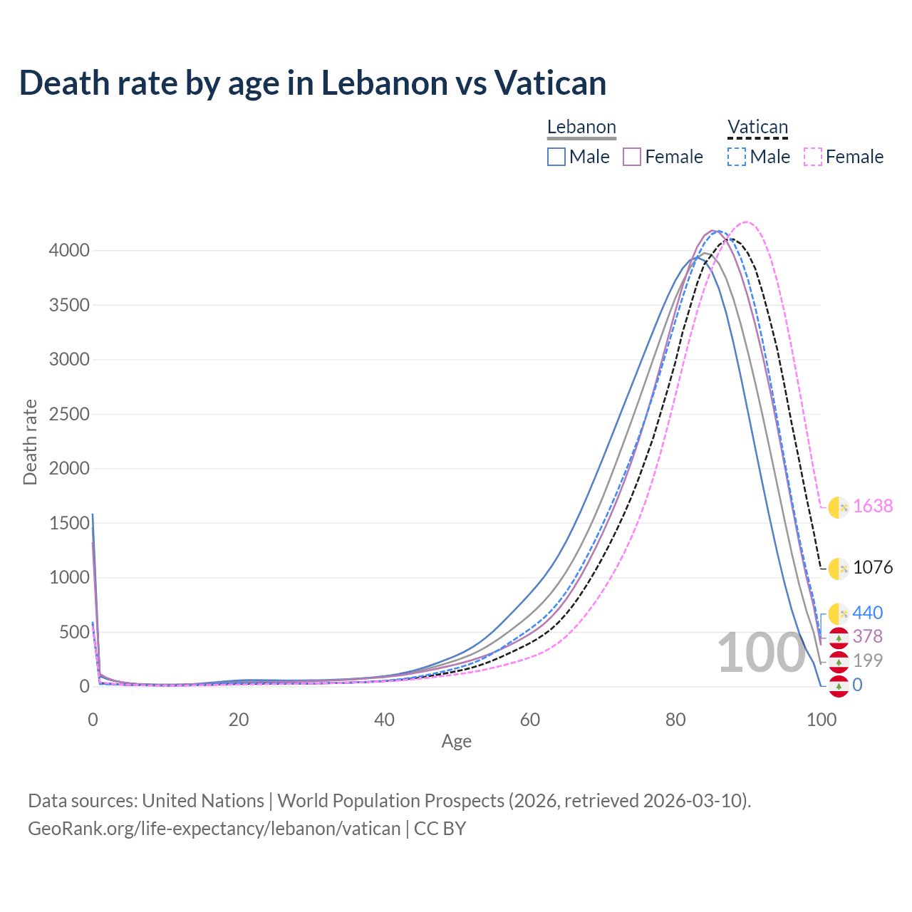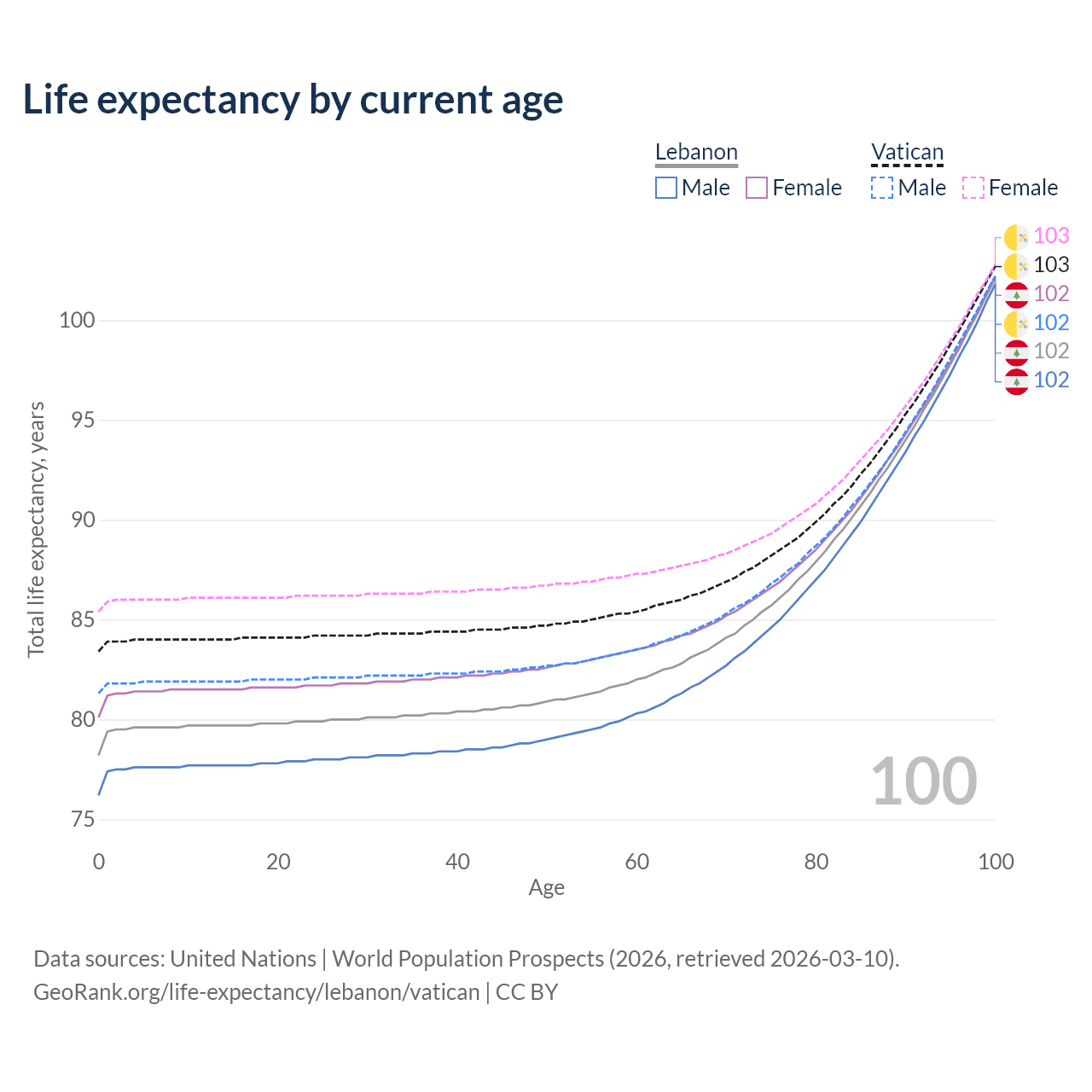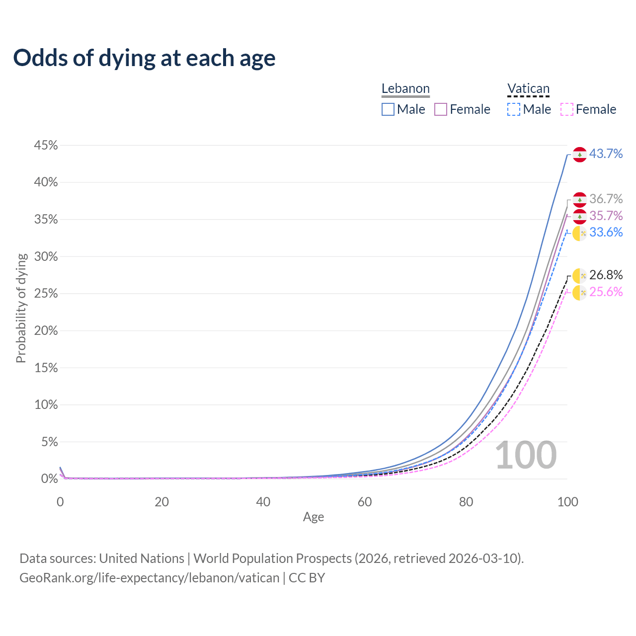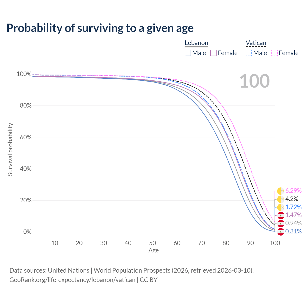 This life expectancy calculator shows the odds of living to 100, 95, 90, and below based on current age for both males and females in Lebanon and the Vatican, along with mean and median age of death. The calculations are based on the 2026 life tables (actuarial tables) from the UN World Population Prospects.
