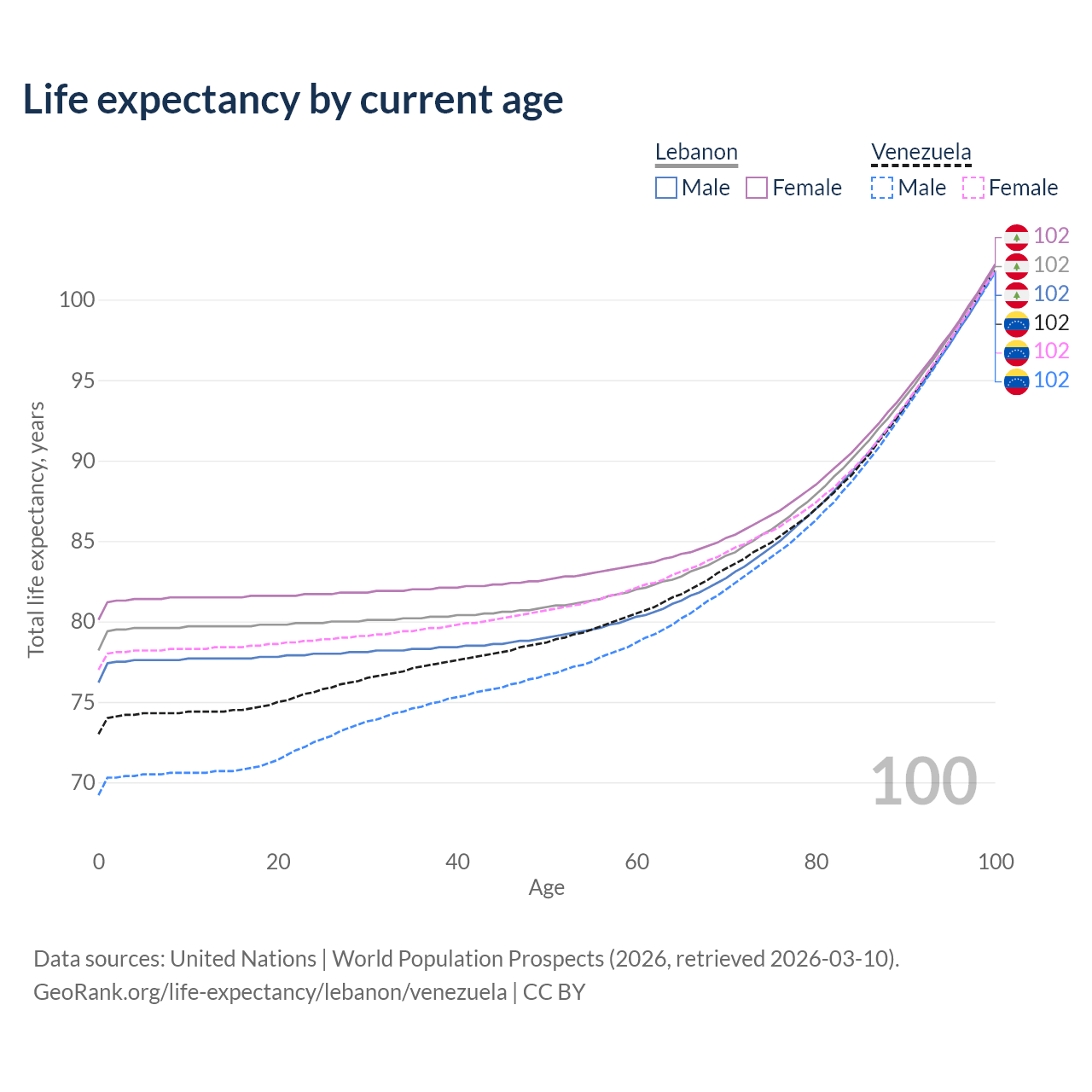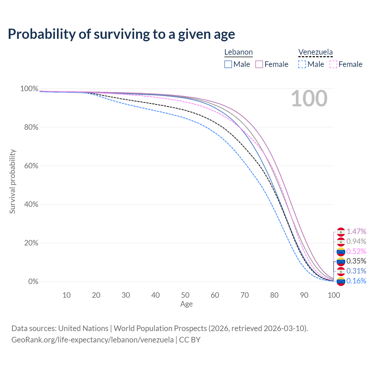 This life expectancy calculator shows the odds of living to 100, 95, 90, and below based on current age for both males and females in Lebanon and Venezuela, along with mean and median age of death. The calculations are based on the 2026 life tables (actuarial tables) from the UN World Population Prospects.