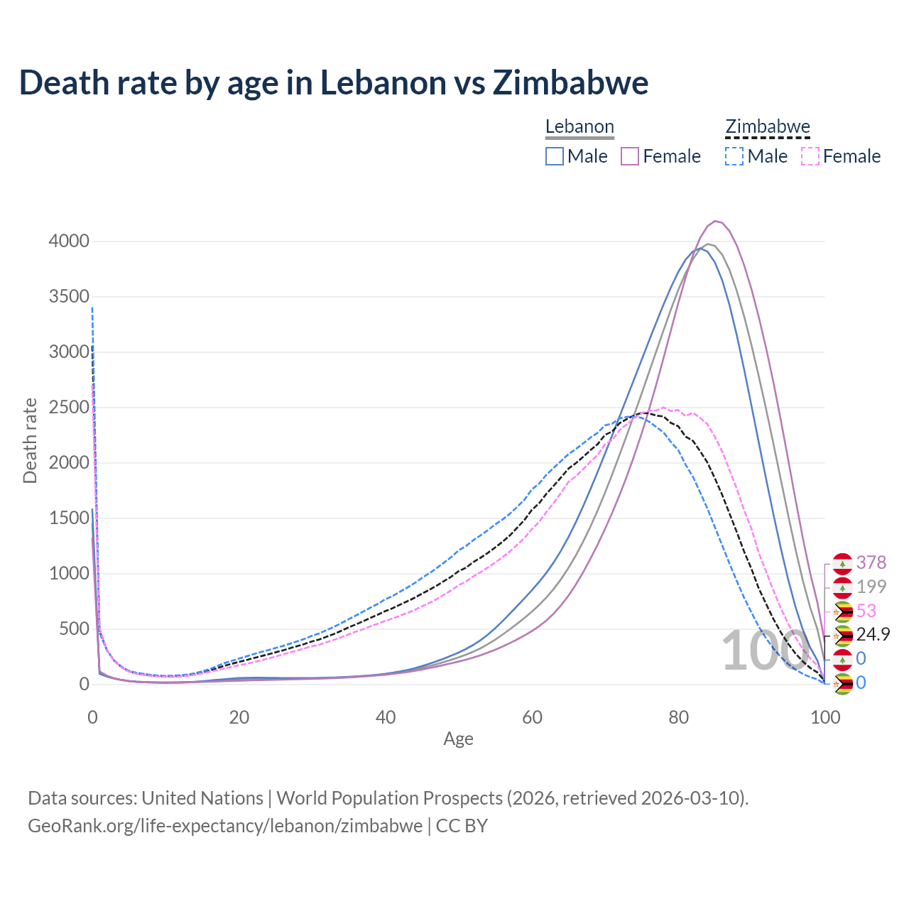In Lebanon, the most common age of death is 84, compared to 0 in Zimbabwe. The median age of death is 81.6 in Lebanon and 68.8 in Zimbabwe, meaning only half of each cohort is expected to live past that age.