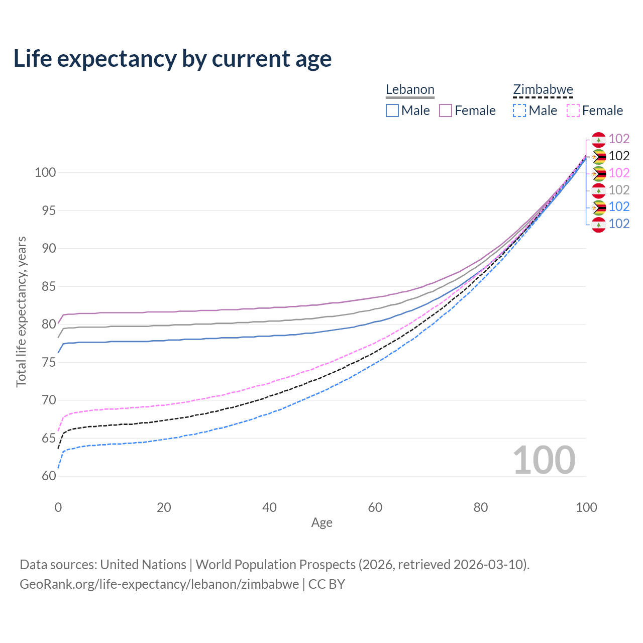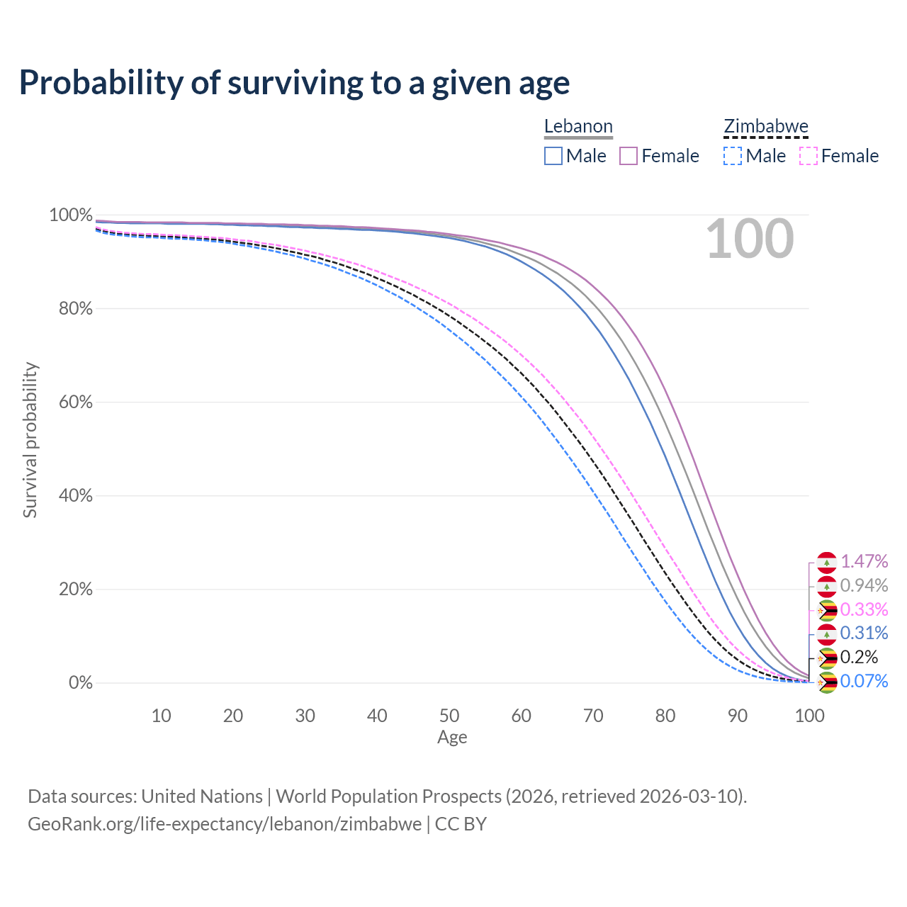 This life expectancy calculator shows the odds of living to 100, 95, 90, and below based on current age for both males and females in Lebanon and Zimbabwe, along with mean and median age of death. The calculations are based on the 2026 life tables (actuarial tables) from the UN World Population Prospects.