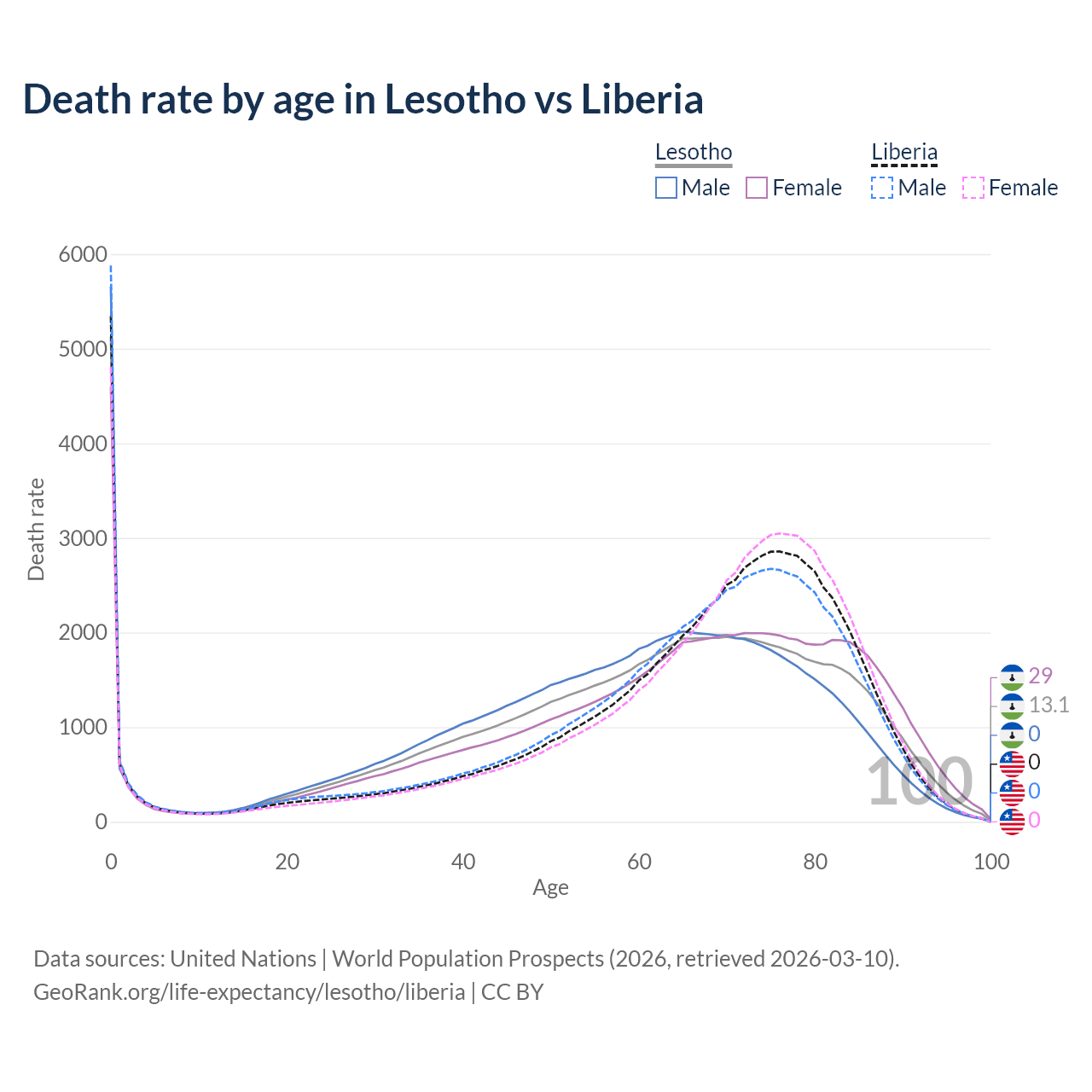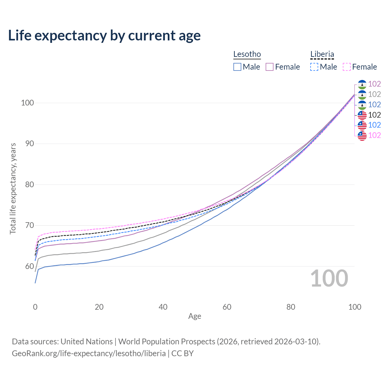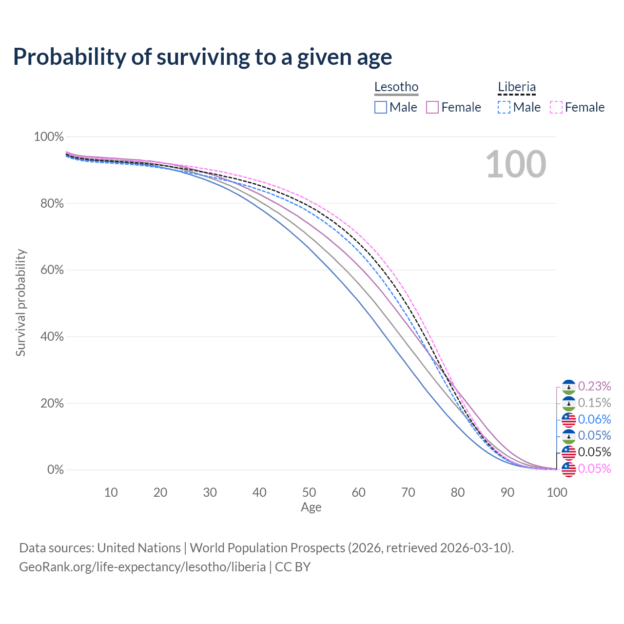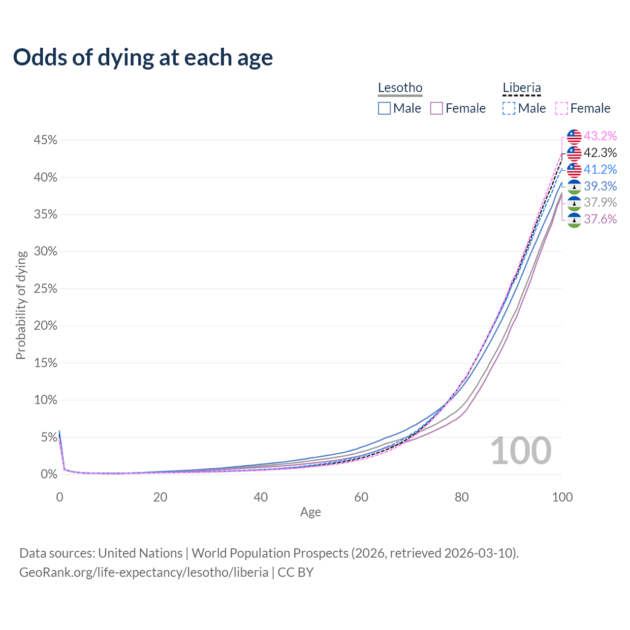 This life expectancy calculator shows the odds of living to 100, 95, 90, and below based on current age for both males and females in Lesotho and Liberia, along with mean and median age of death. The calculations are based on the 2026 life tables (actuarial tables) from the UN World Population Prospects.