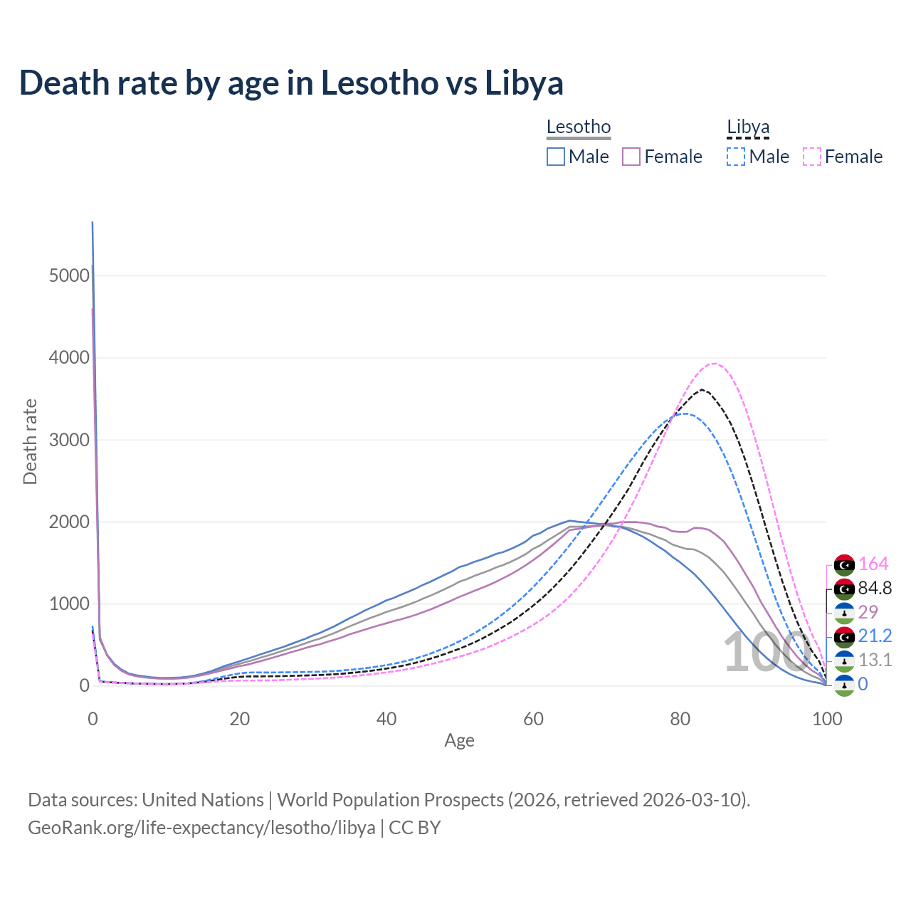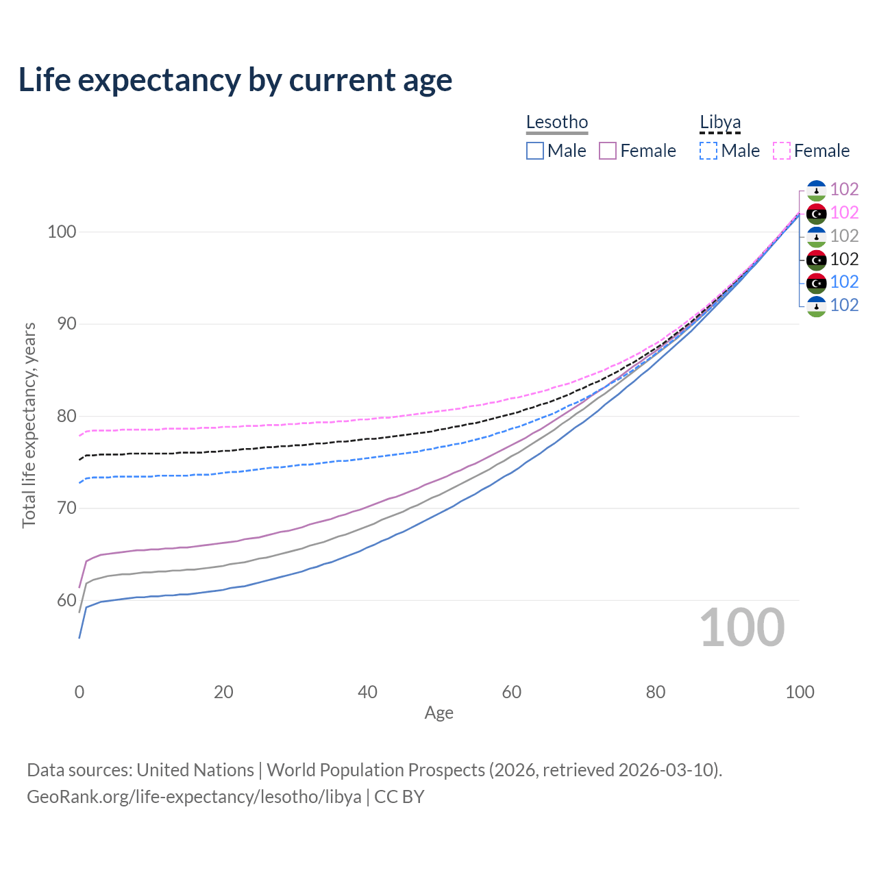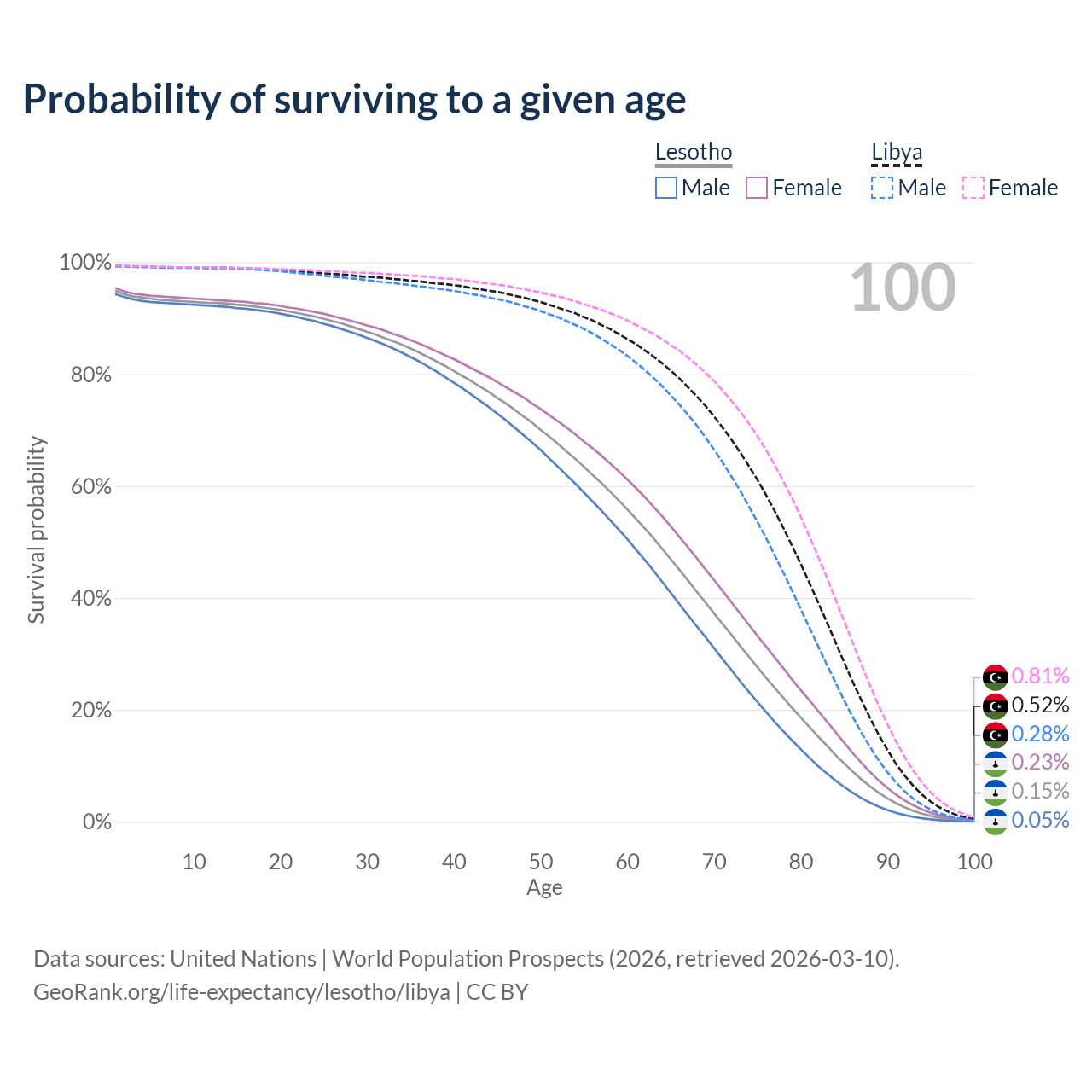 This life expectancy calculator shows the odds of living to 100, 95, 90, and below based on current age for both males and females in Lesotho and Libya, along with mean and median age of death. The calculations are based on the 2026 life tables (actuarial tables) from the UN World Population Prospects.