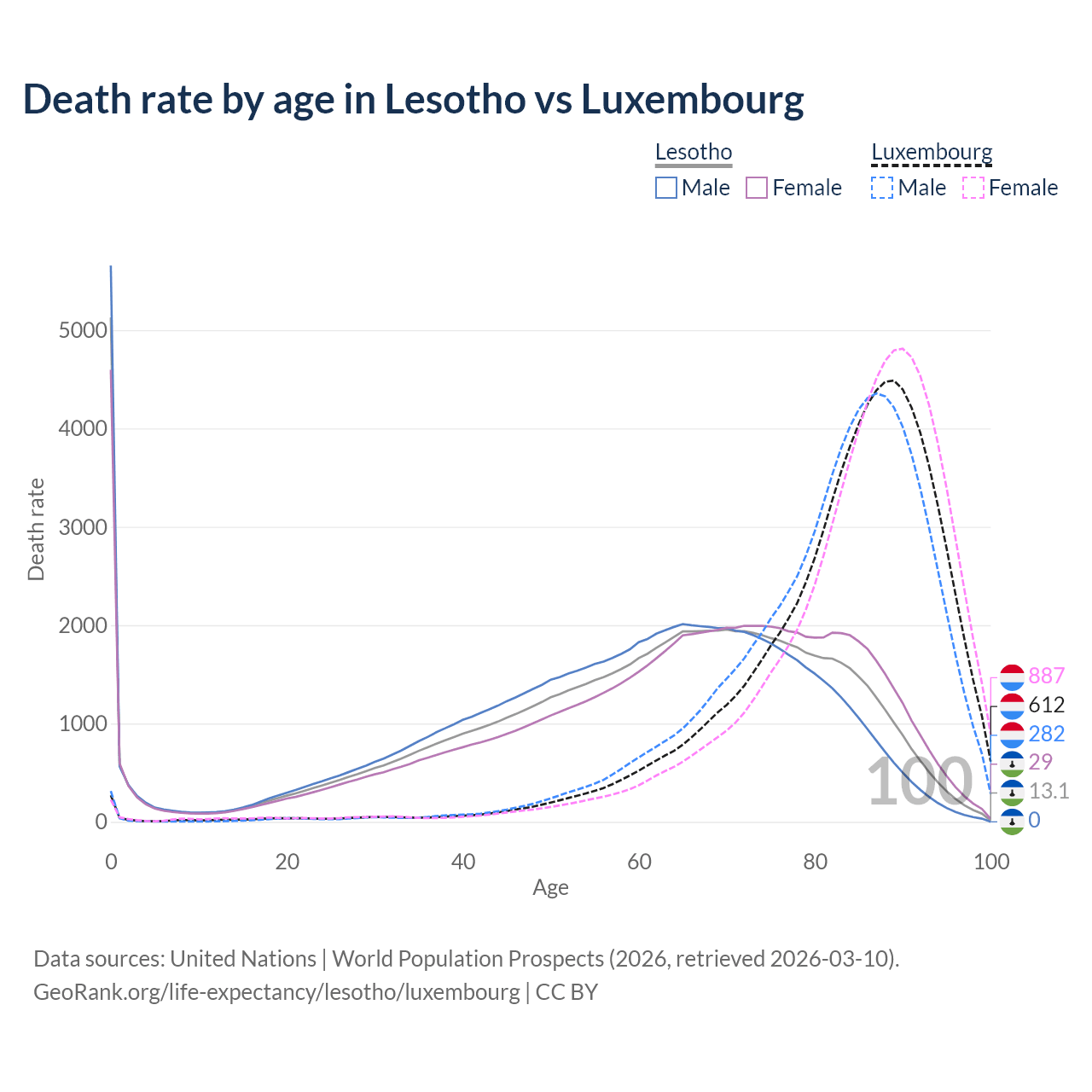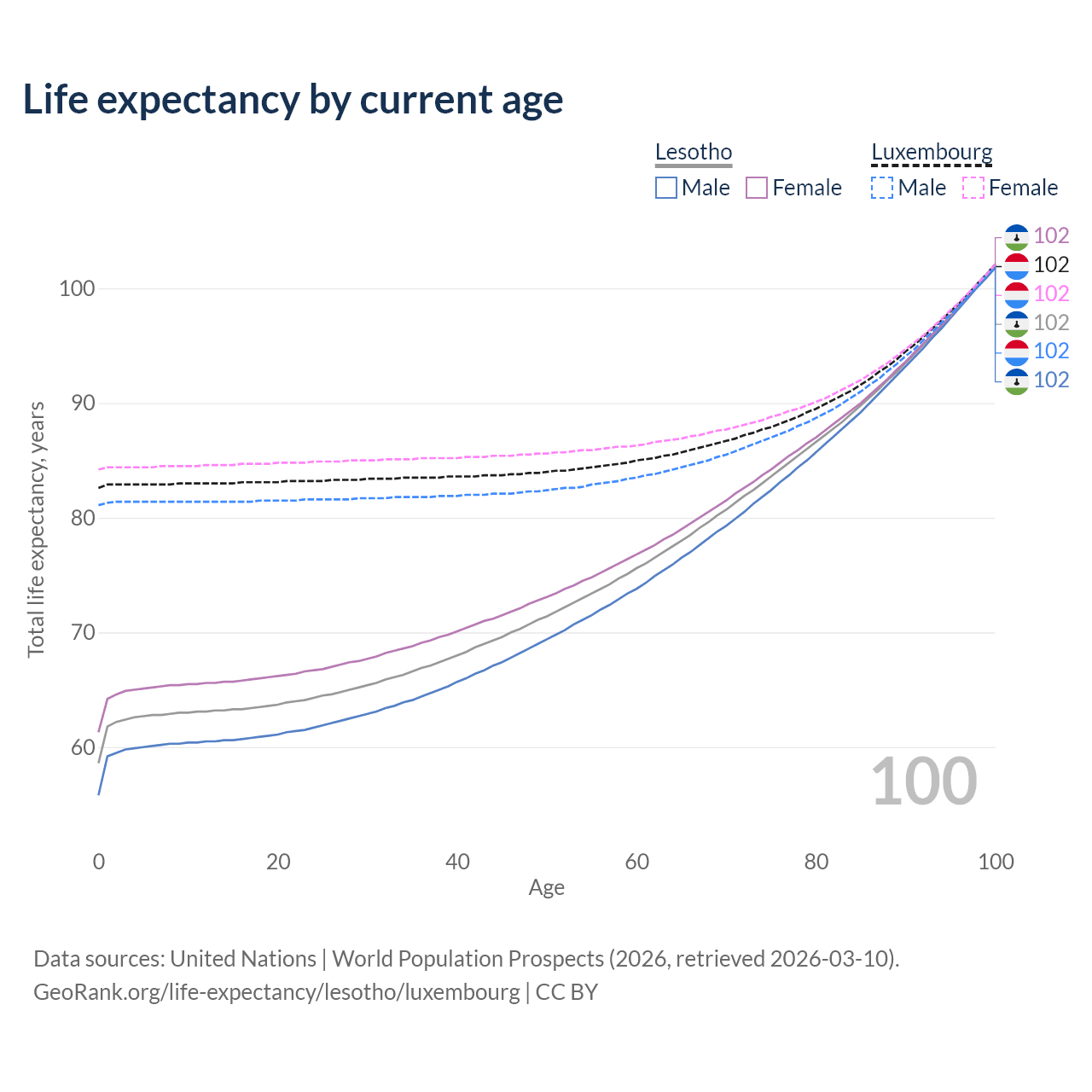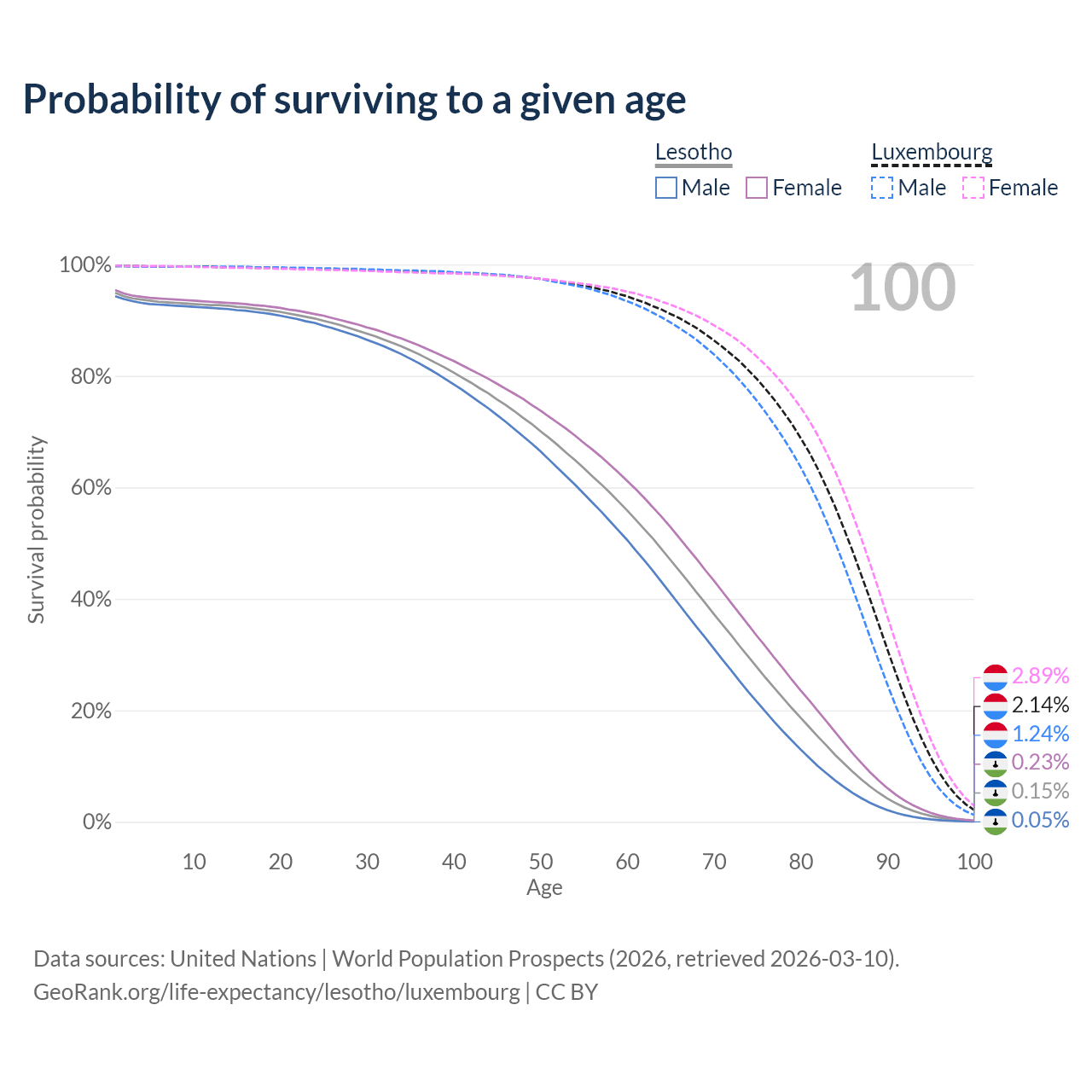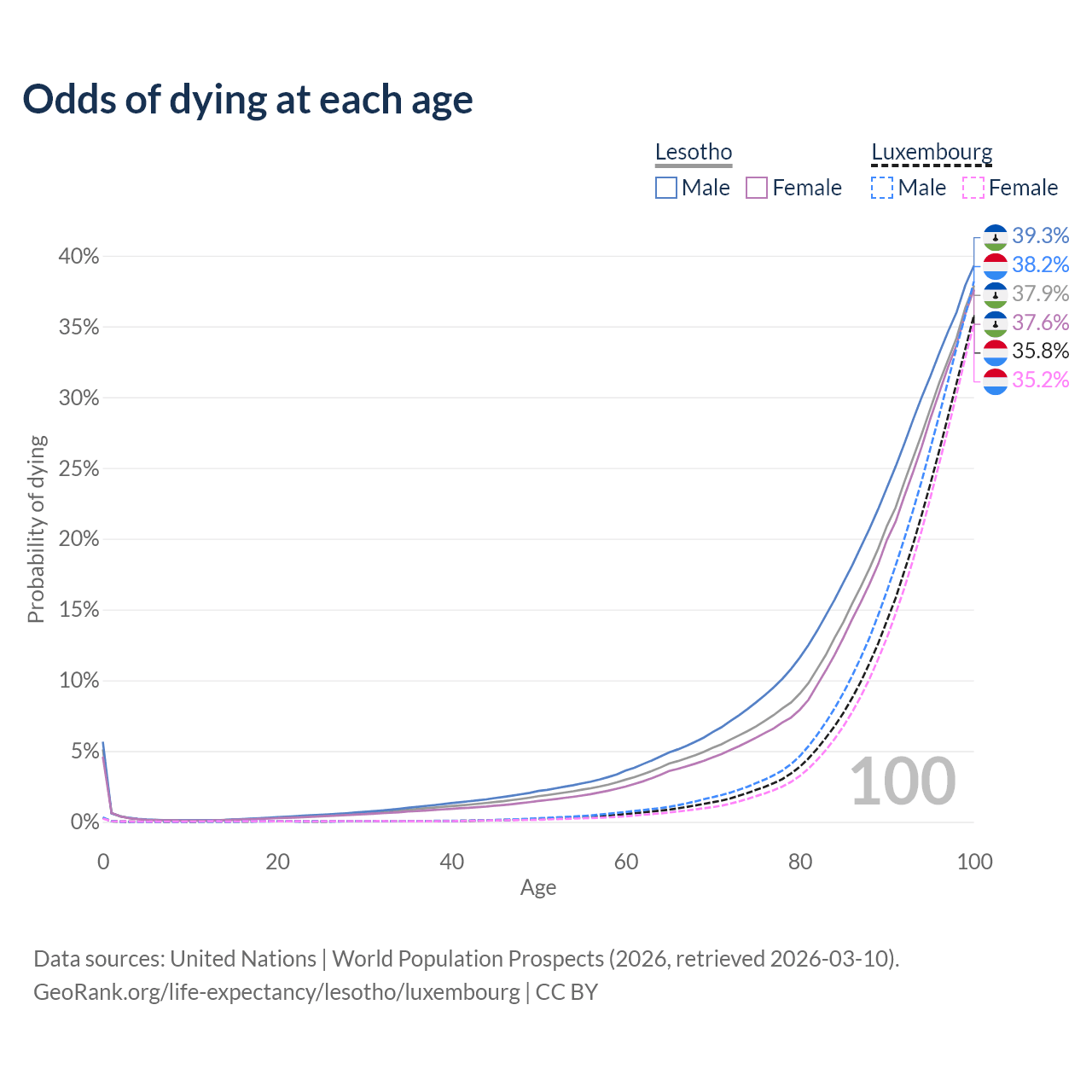 This life expectancy calculator shows the odds of living to 100, 95, 90, and below based on current age for both males and females in Lesotho and Luxembourg, along with mean and median age of death. The calculations are based on the 2026 life tables (actuarial tables) from the UN World Population Prospects.