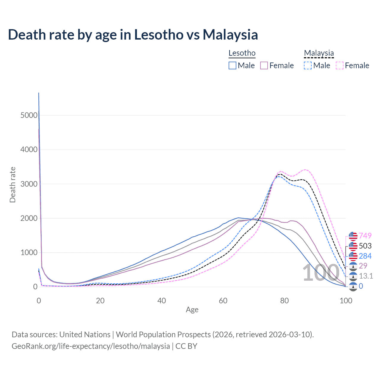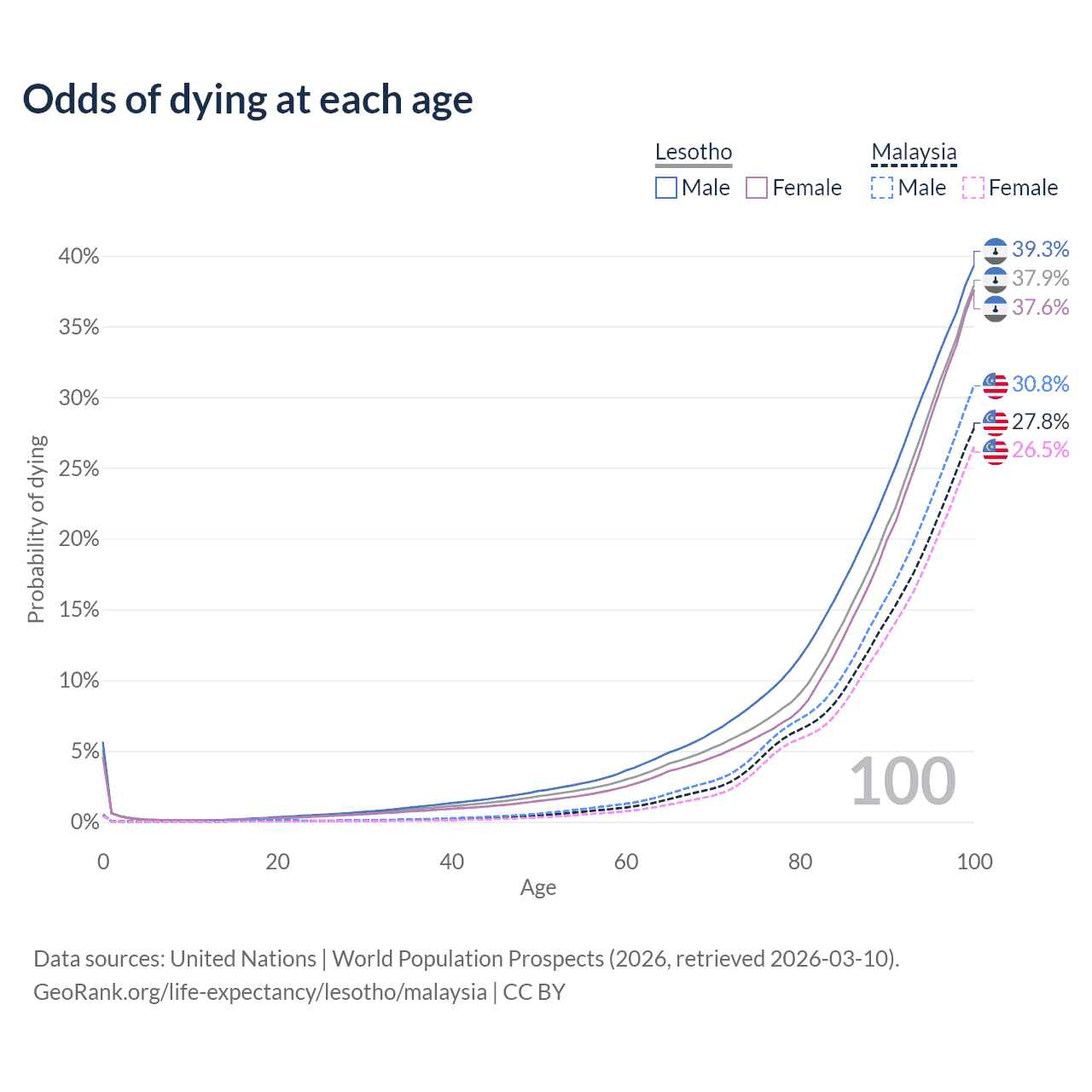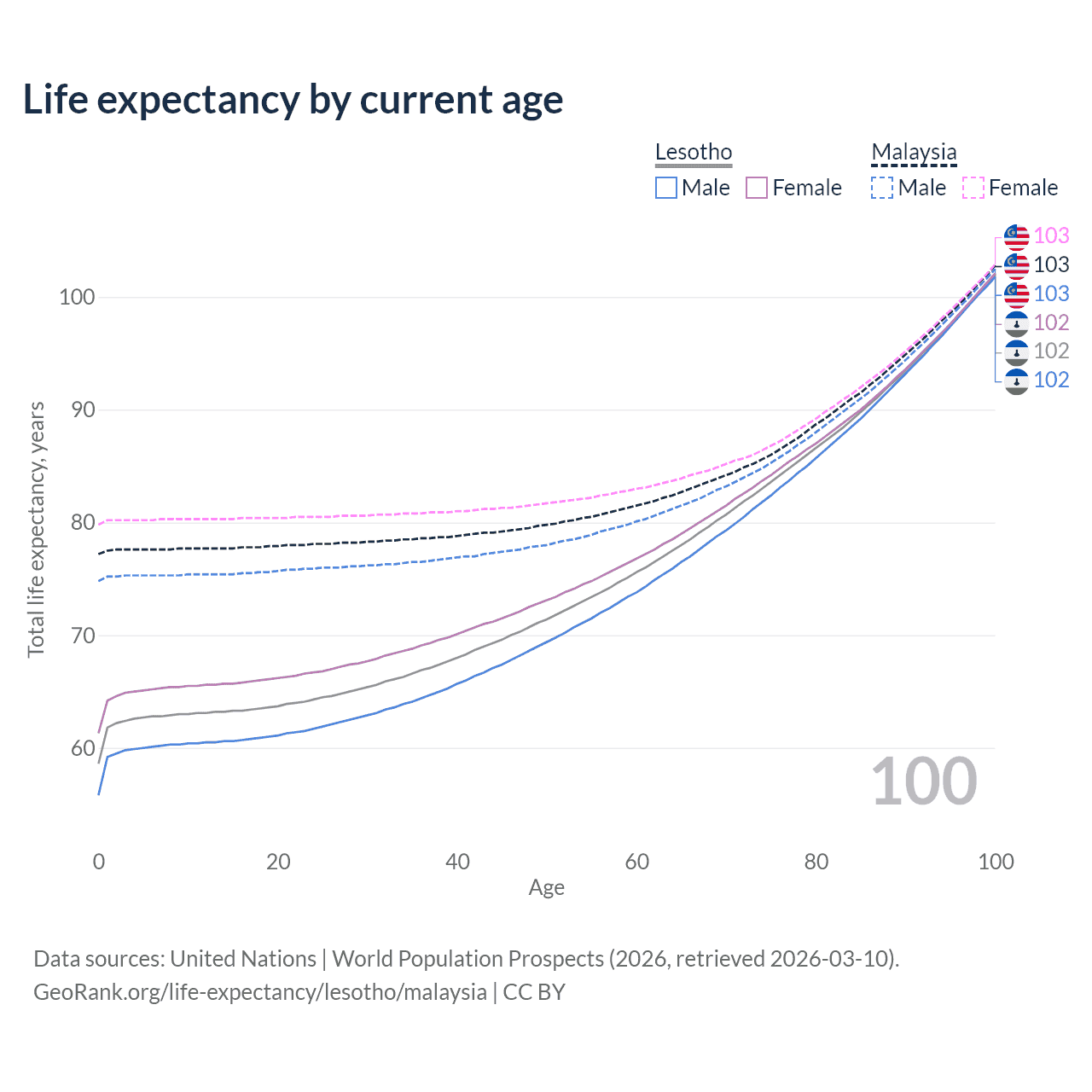 This life expectancy calculator shows the odds of living to 100, 95, 90, and below based on current age for both males and females in Lesotho and Malaysia, along with mean and median age of death. The calculations are based on the 2026 life tables (actuarial tables) from the UN World Population Prospects.