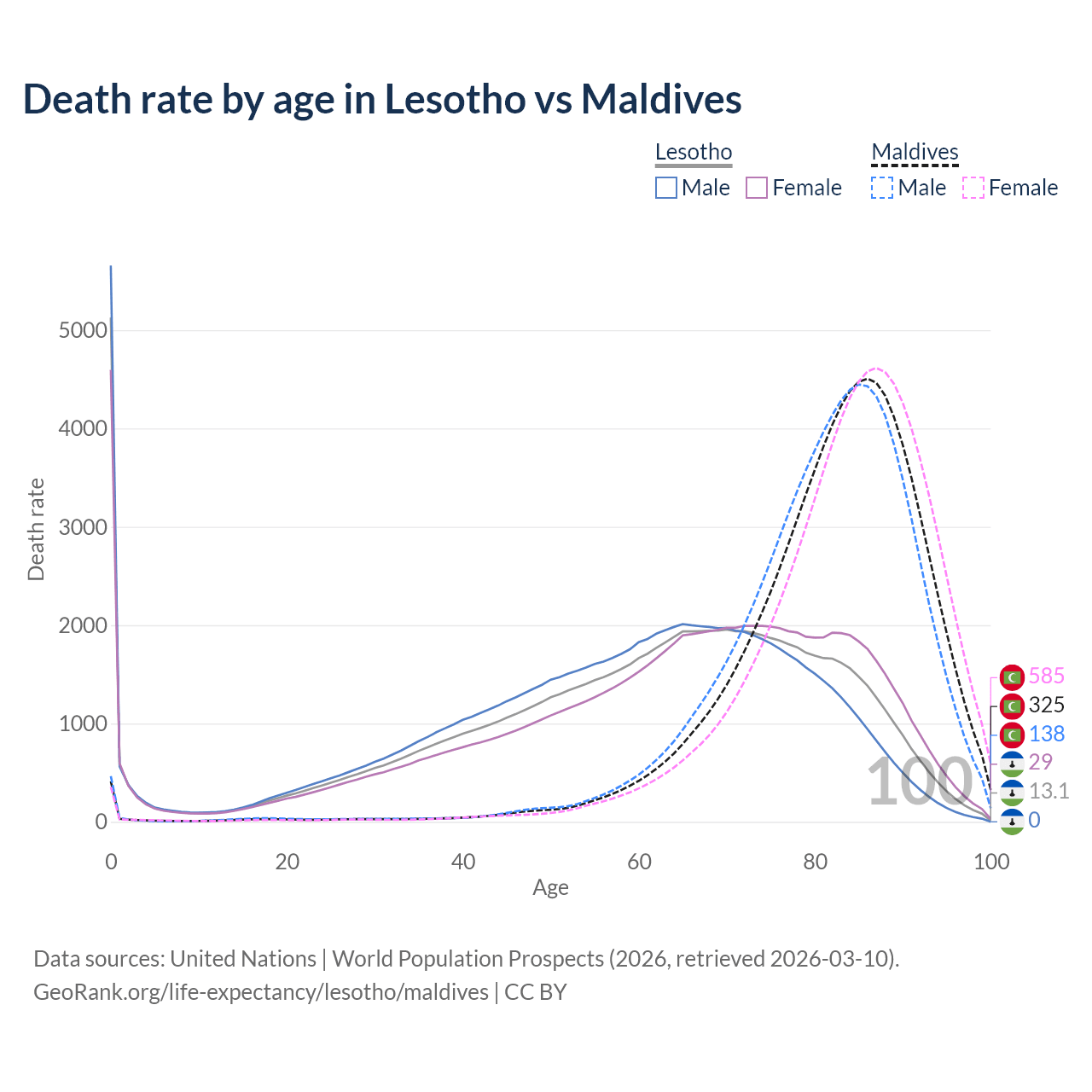In Lesotho, the most common age of death is 0, compared to 86 in Maldives. The median age of death is 63.4 in Lesotho and 83.8 in Maldives, meaning only half of each cohort is expected to live past that age.