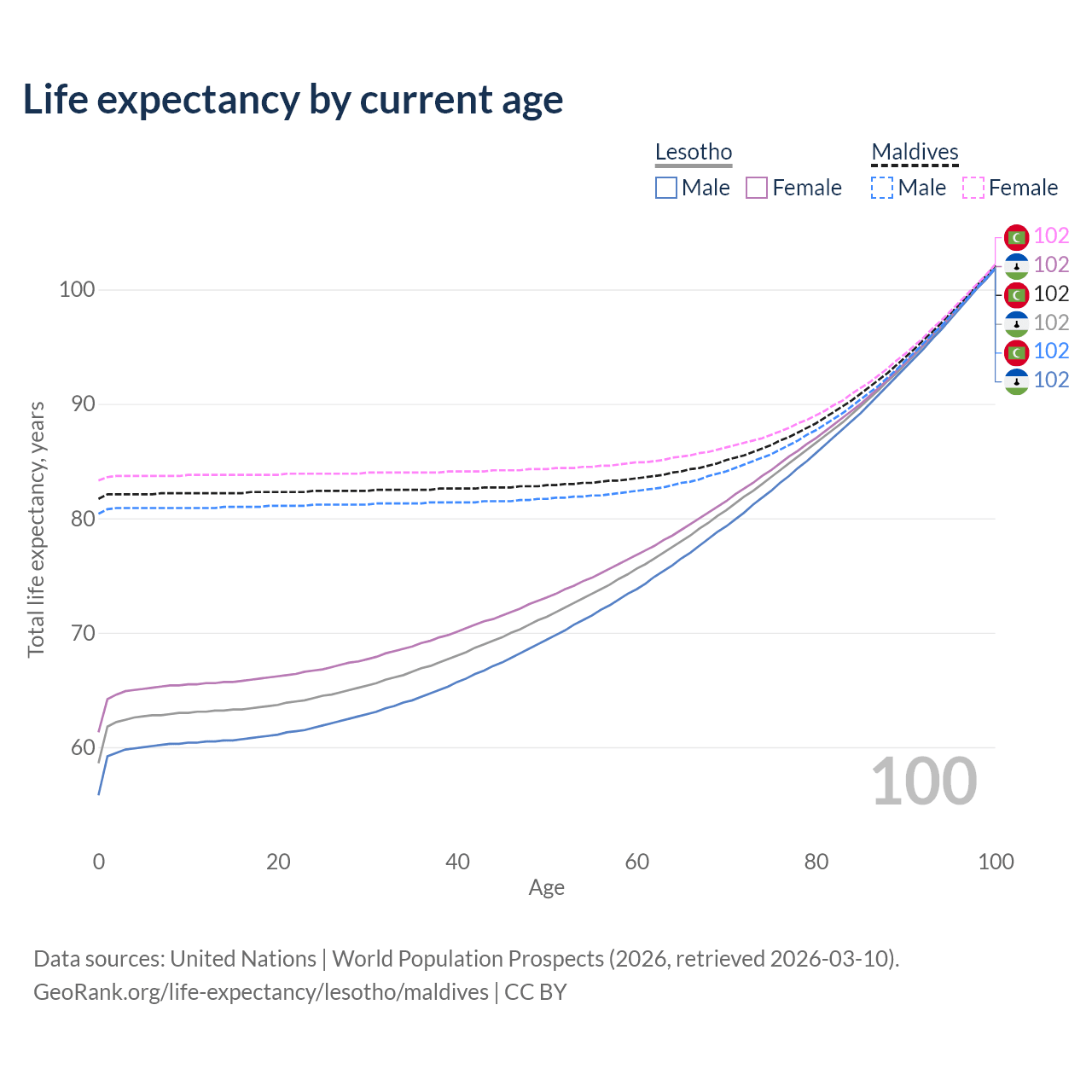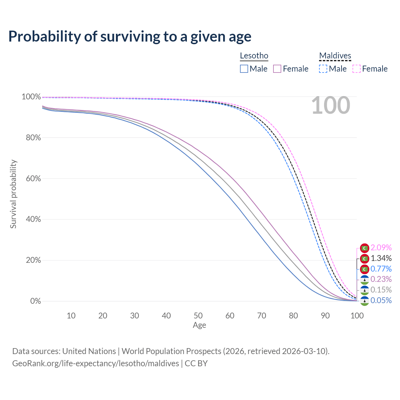 This life expectancy calculator shows the odds of living to 100, 95, 90, and below based on current age for both males and females in Lesotho and Maldives, along with mean and median age of death. The calculations are based on the 2026 life tables (actuarial tables) from the UN World Population Prospects.