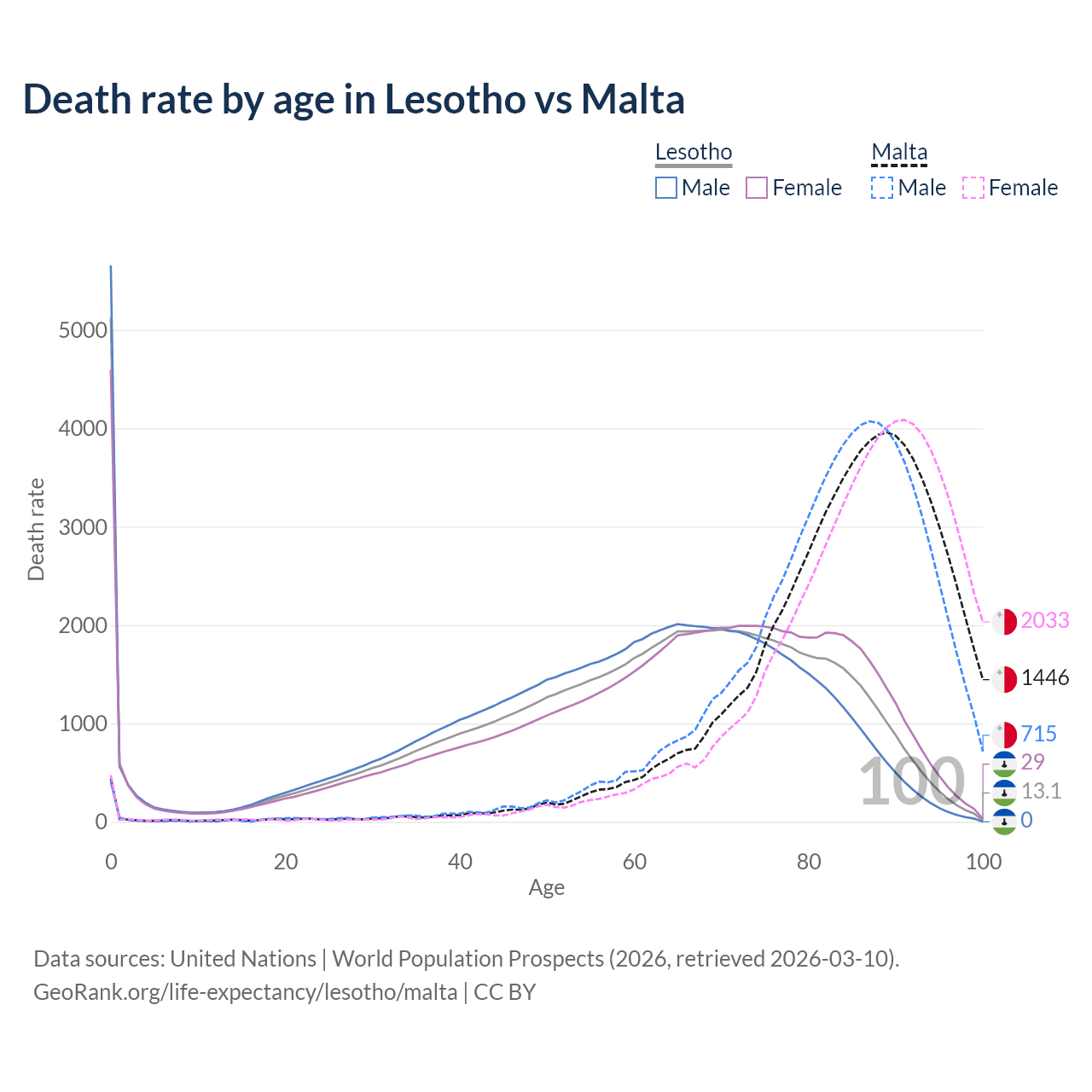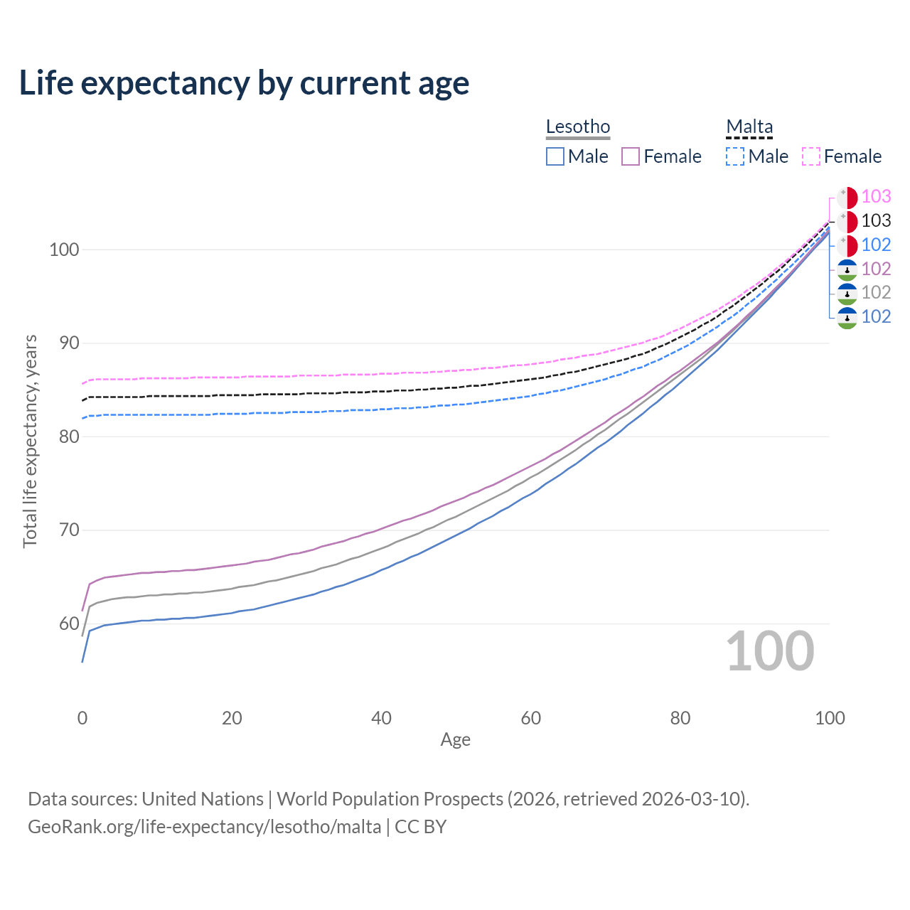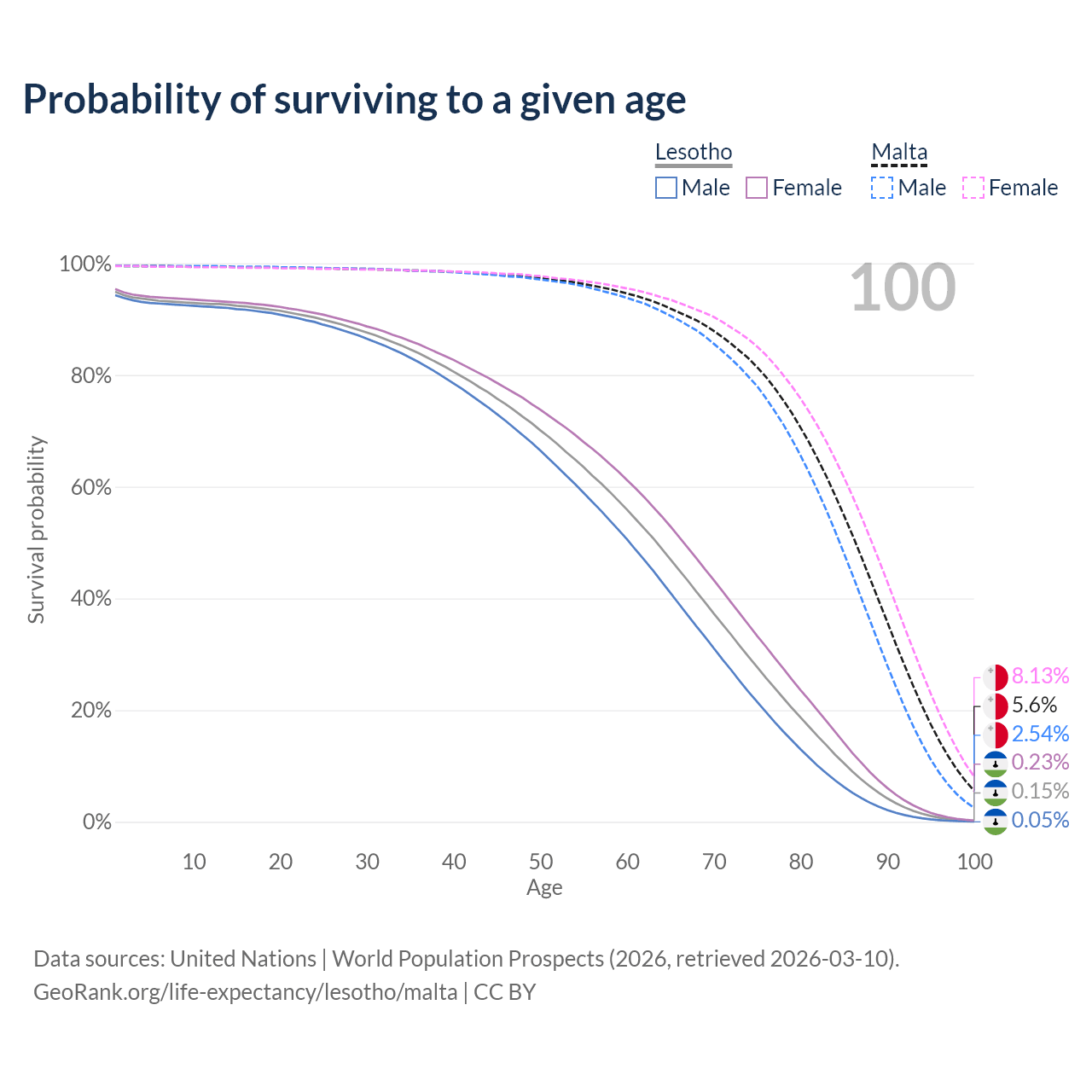 This life expectancy calculator shows the odds of living to 100, 95, 90, and below based on current age for both males and females in Lesotho and Malta, along with mean and median age of death. The calculations are based on the 2026 life tables (actuarial tables) from the UN World Population Prospects.