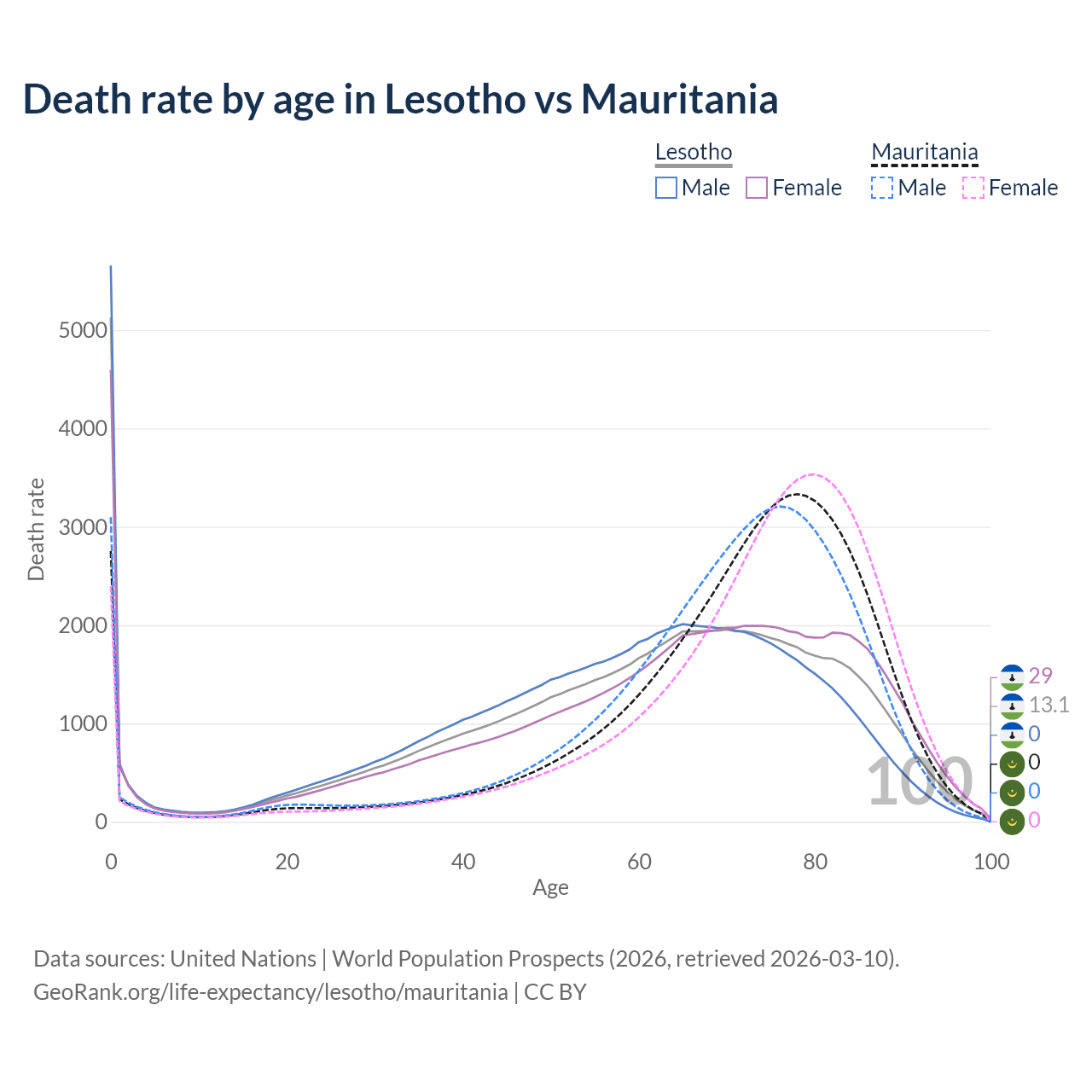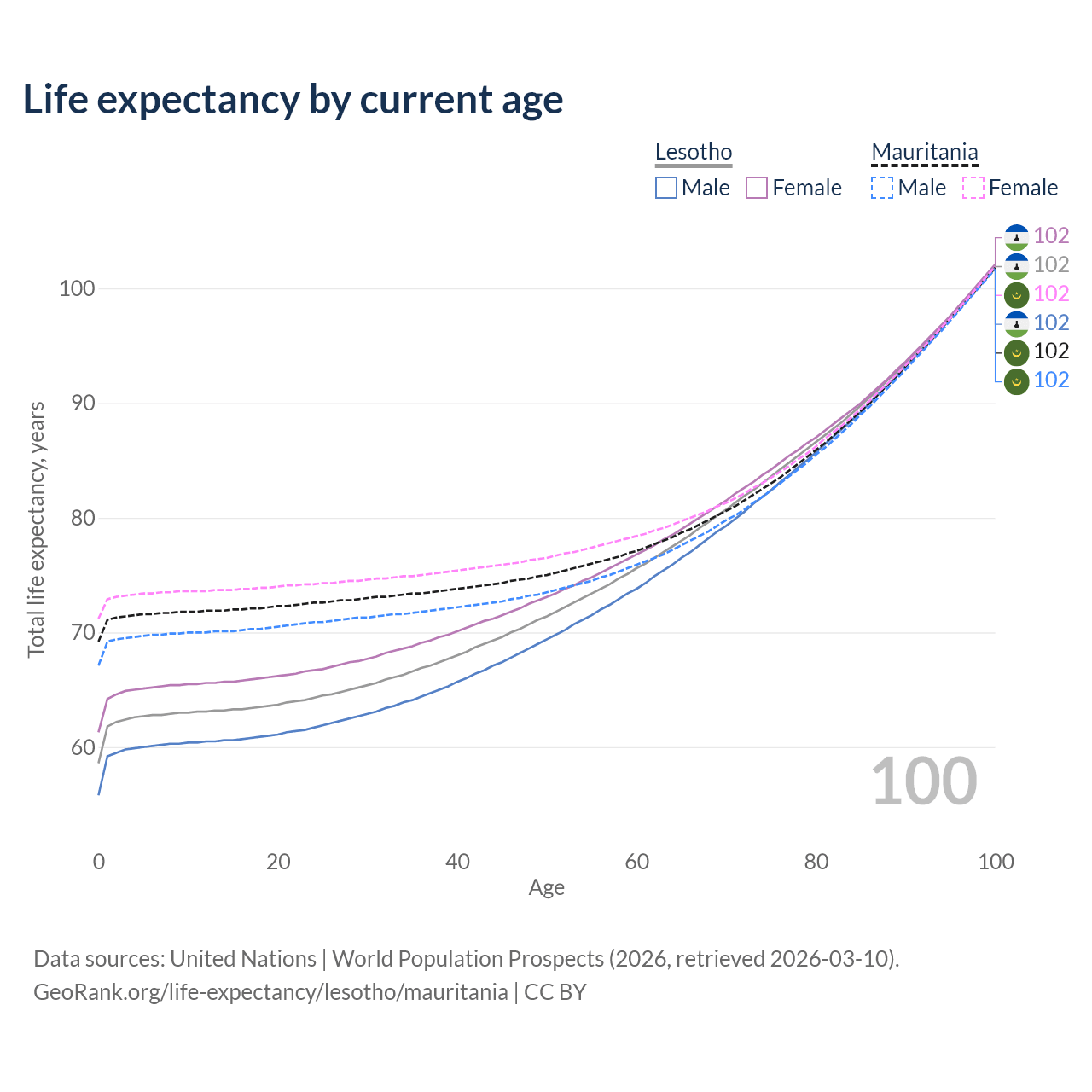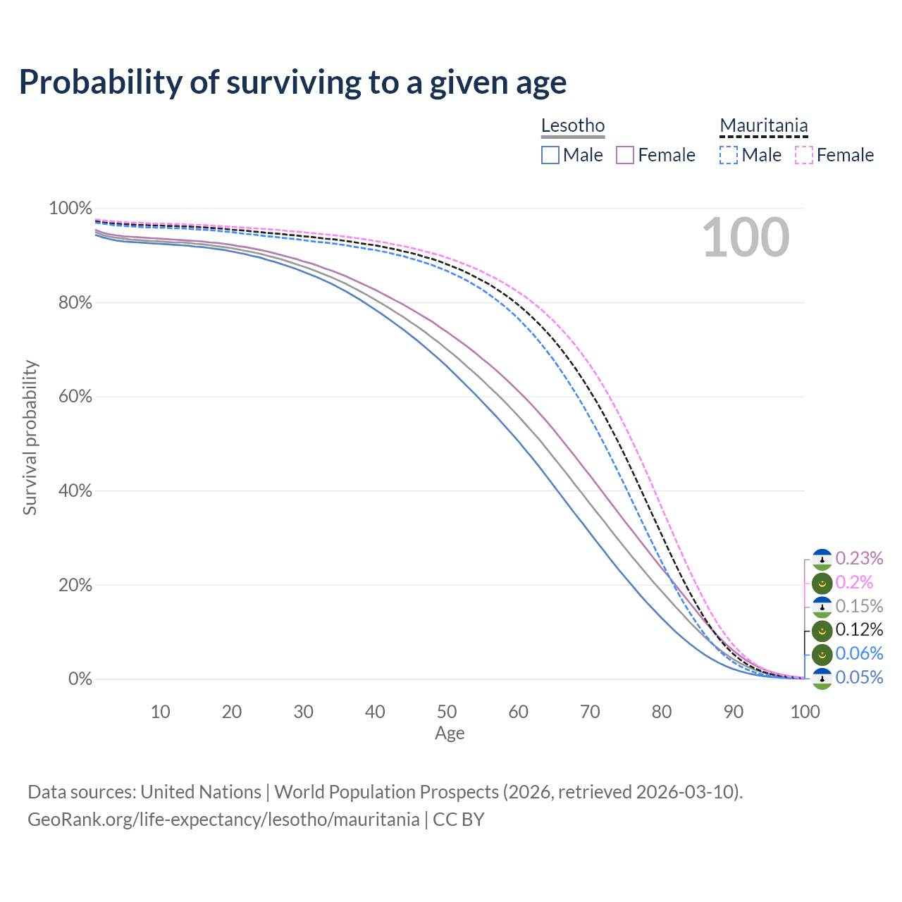 This life expectancy calculator shows the odds of living to 100, 95, 90, and below based on current age for both males and females in Lesotho and Mauritania, along with mean and median age of death. The calculations are based on the 2026 life tables (actuarial tables) from the UN World Population Prospects.
