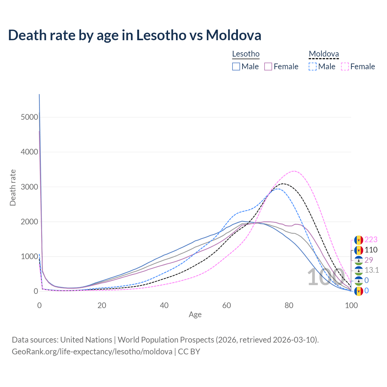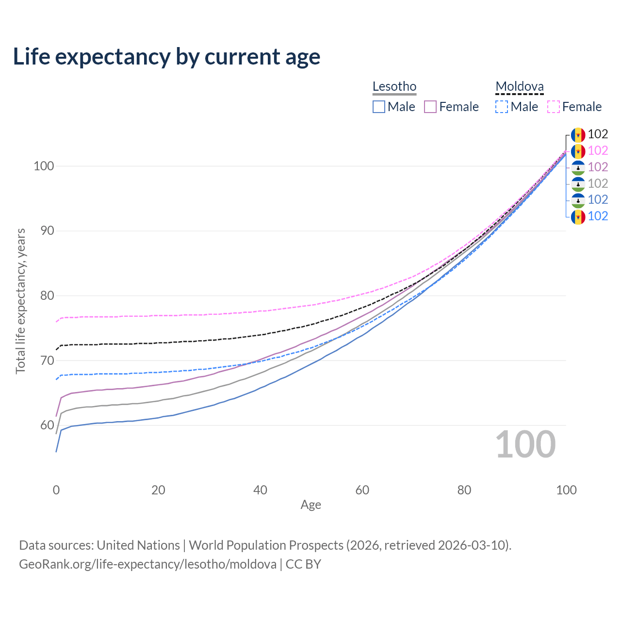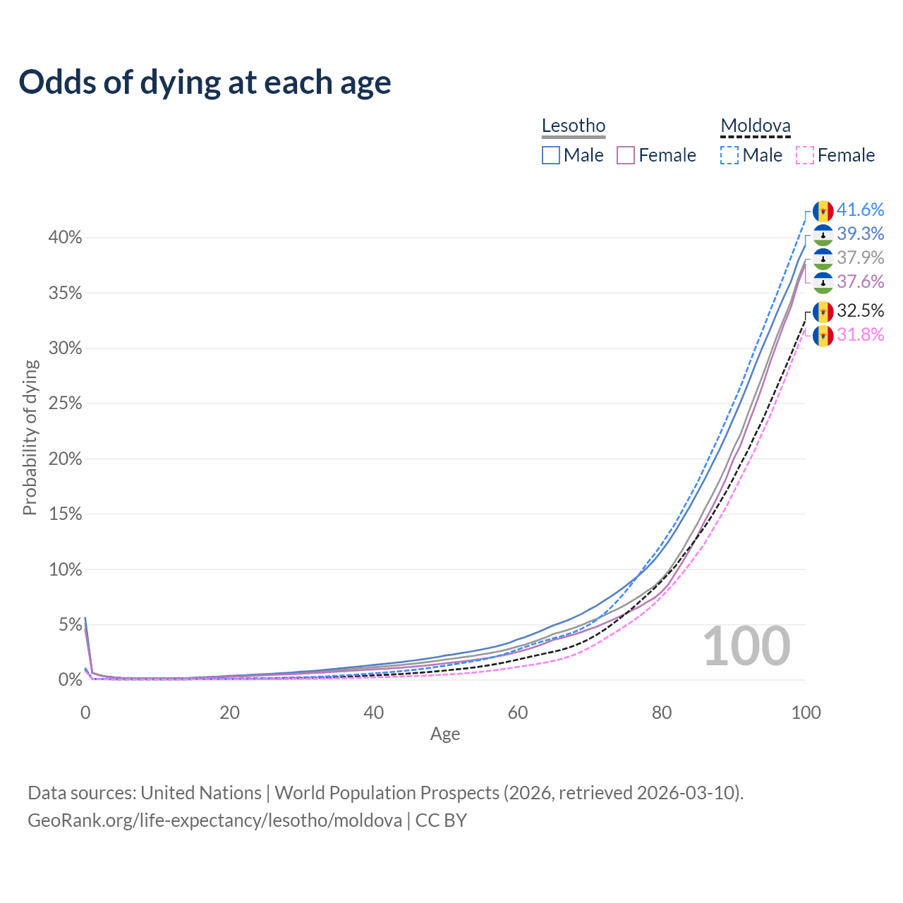 This life expectancy calculator shows the odds of living to 100, 95, 90, and below based on current age for both males and females in Lesotho and Moldova, along with mean and median age of death. The calculations are based on the 2026 life tables (actuarial tables) from the UN World Population Prospects.