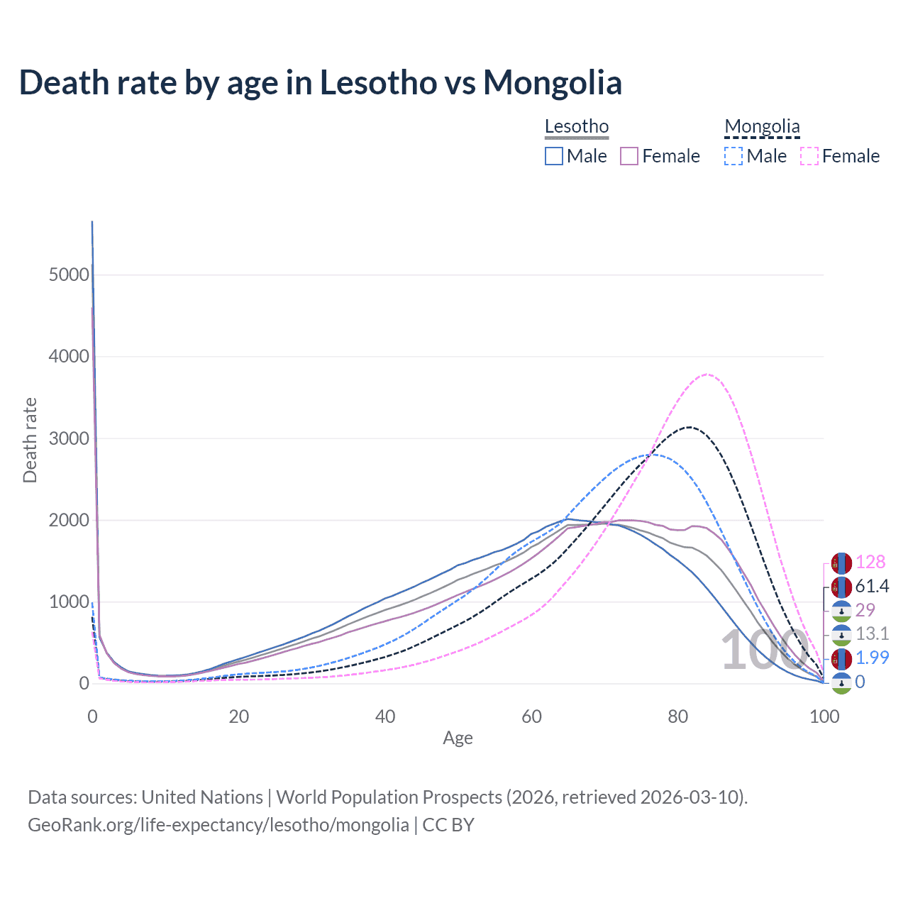 In Lesotho, the most common age of death is 0, compared to 82 in Mongolia. The median age of death is 63.4 in Lesotho and 76 in Mongolia, meaning only half of each cohort is expected to live past that age.