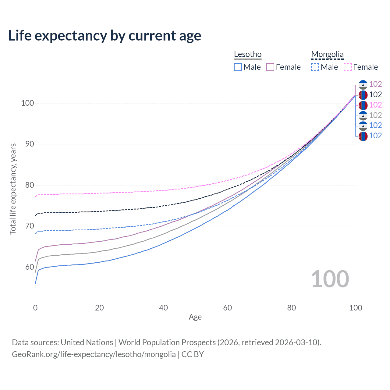 This life expectancy calculator shows the odds of living to 100, 95, 90, and below based on current age for both males and females in Lesotho and Mongolia, along with mean and median age of death. The calculations are based on the 2026 life tables (actuarial tables) from the UN World Population Prospects.