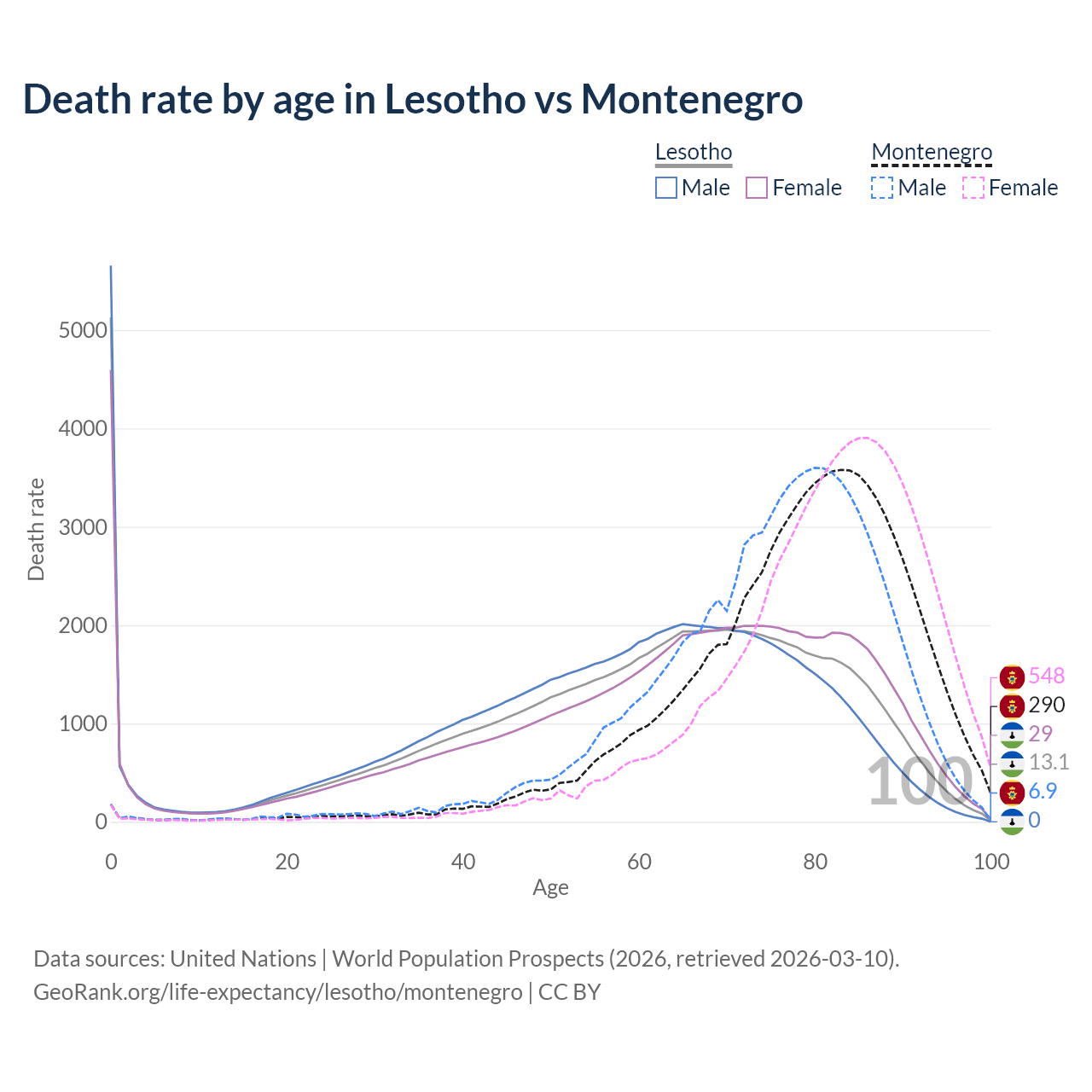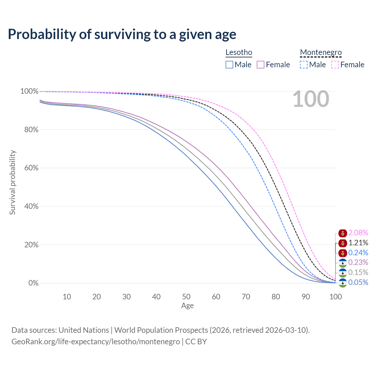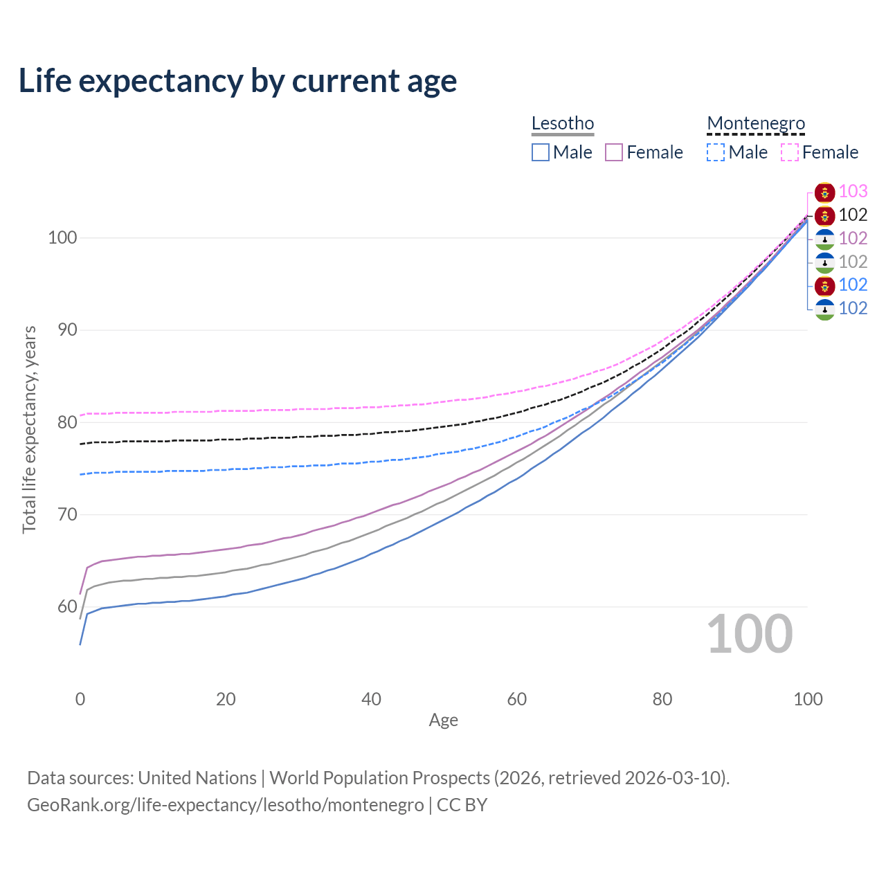 This life expectancy calculator shows the odds of living to 100, 95, 90, and below based on current age for both males and females in Lesotho and Montenegro, along with mean and median age of death. The calculations are based on the 2026 life tables (actuarial tables) from the UN World Population Prospects.