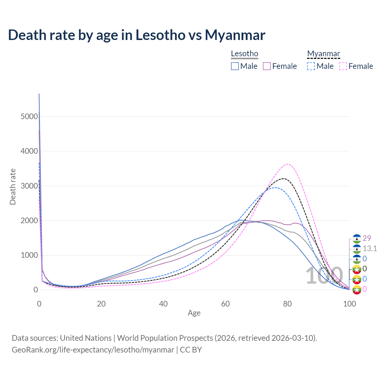 The average life expectancy at birth is 58.6 years in Lesotho vs 67.5 in Myanmar. Lesotho is ranked 193/197 by life expectancy, and Myanmar is 157/197. In Lesotho, the life expectancy is 55.8 years for males and 61.3 years for females. In Myanmar, it's 64.4 years for males and 70.8 years for females.