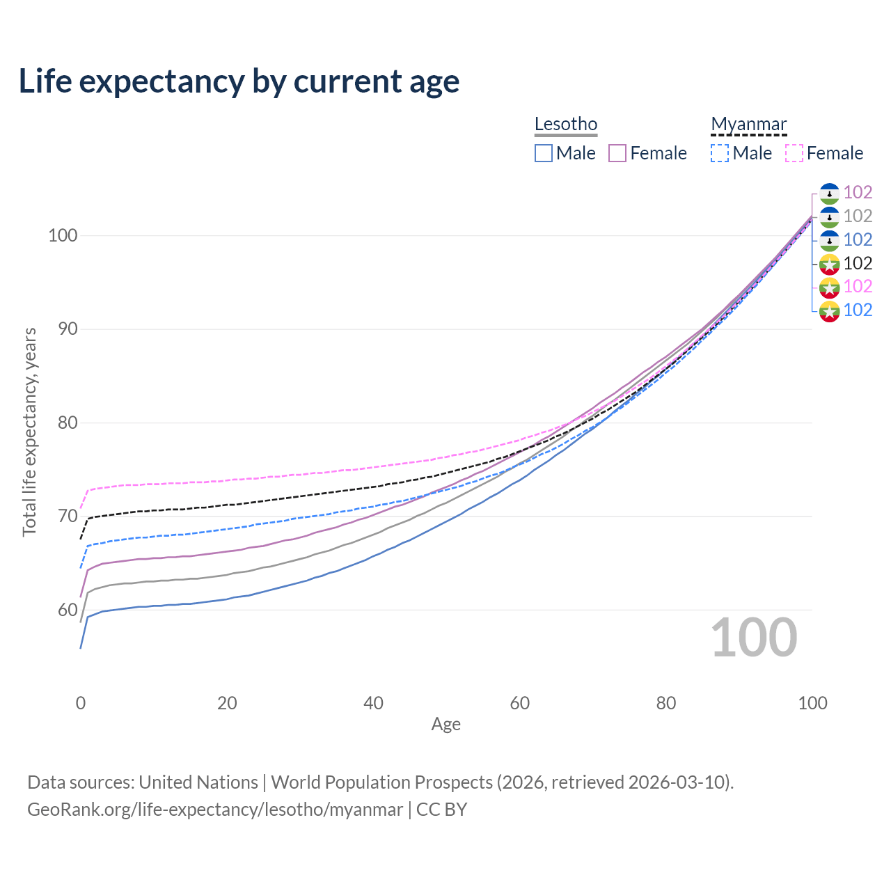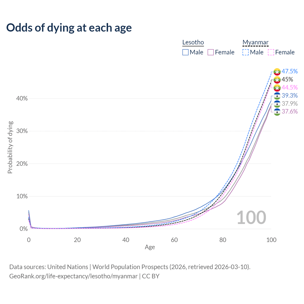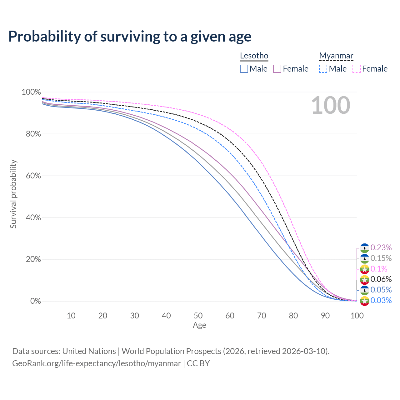 This life expectancy calculator shows the odds of living to 100, 95, 90, and below based on current age for both males and females in Lesotho and Myanmar, along with mean and median age of death. The calculations are based on the 2026 life tables (actuarial tables) from the UN World Population Prospects.