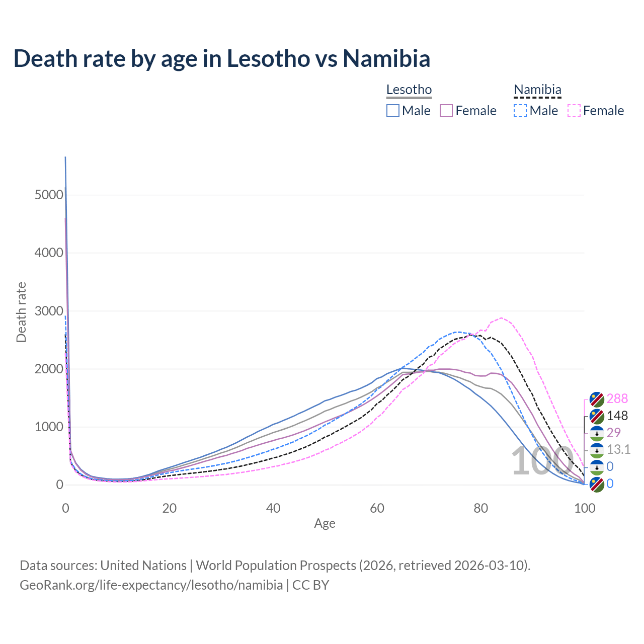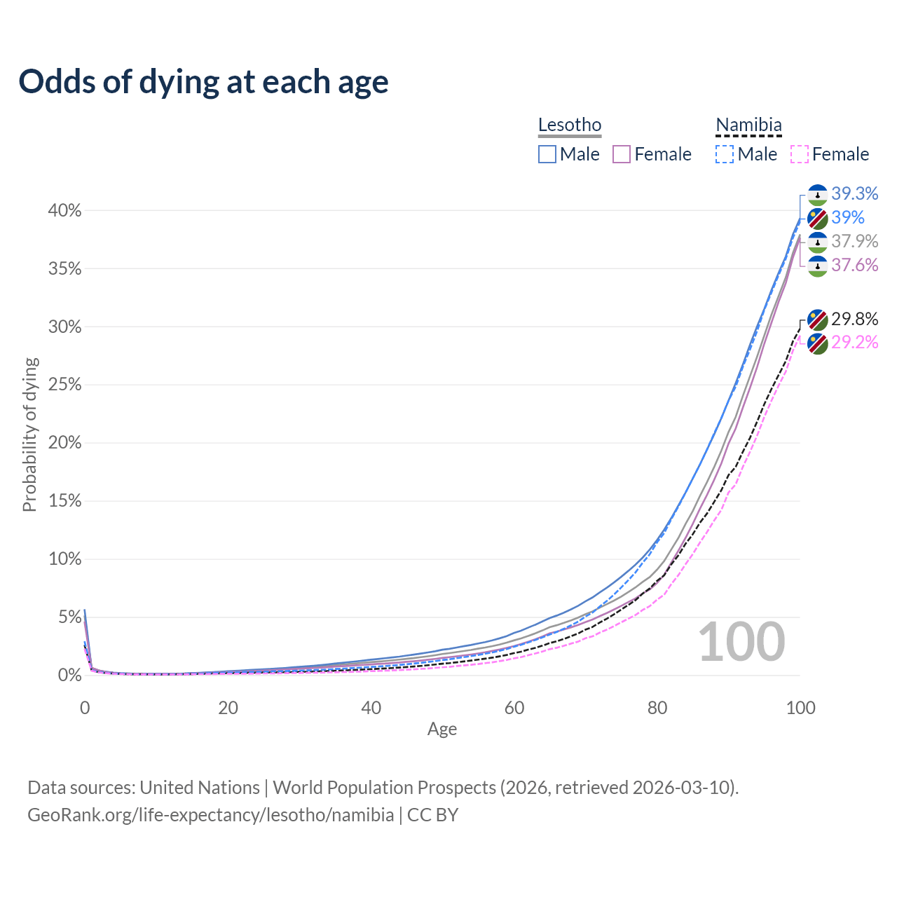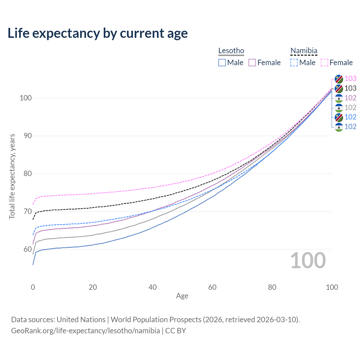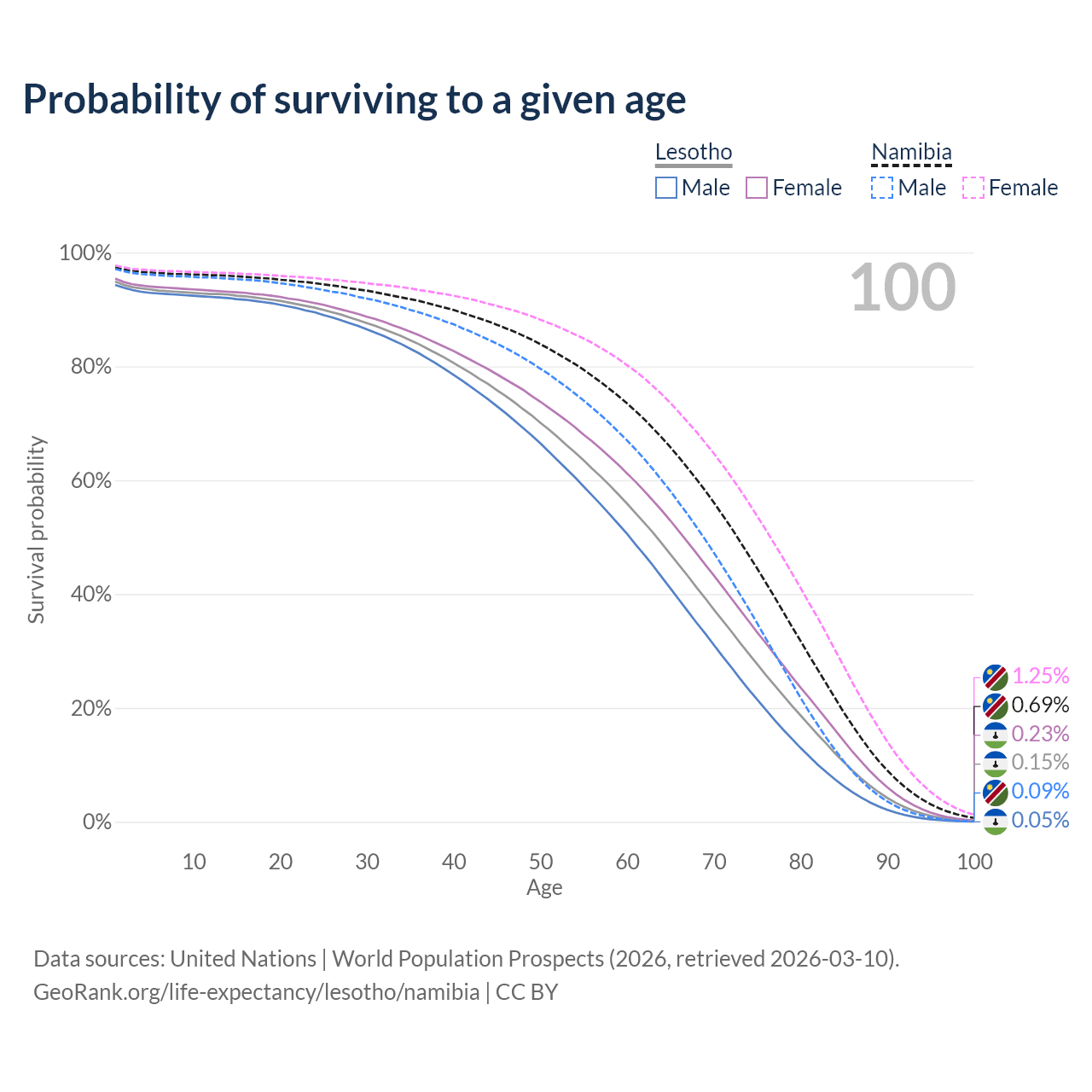 This life expectancy calculator shows the odds of living to 100, 95, 90, and below based on current age for both males and females in Lesotho and Namibia, along with mean and median age of death. The calculations are based on the 2026 life tables (actuarial tables) from the UN World Population Prospects.