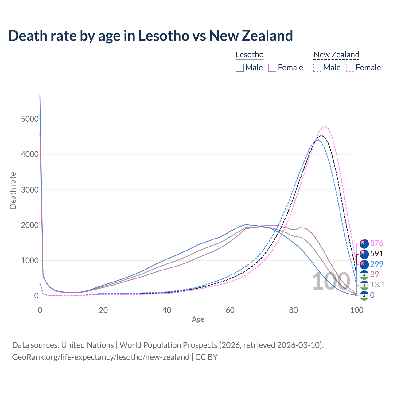 In Lesotho, the most common age of death is 0, compared to 89 in New Zealand. The median age of death is 63.4 in Lesotho and 85.8 in New Zealand, meaning only half of each cohort is expected to live past that age.