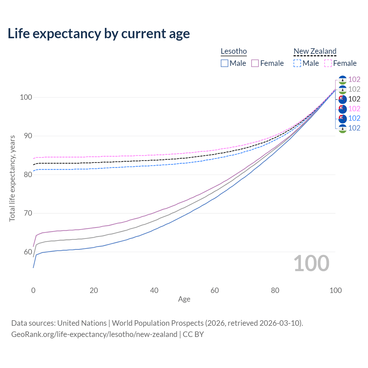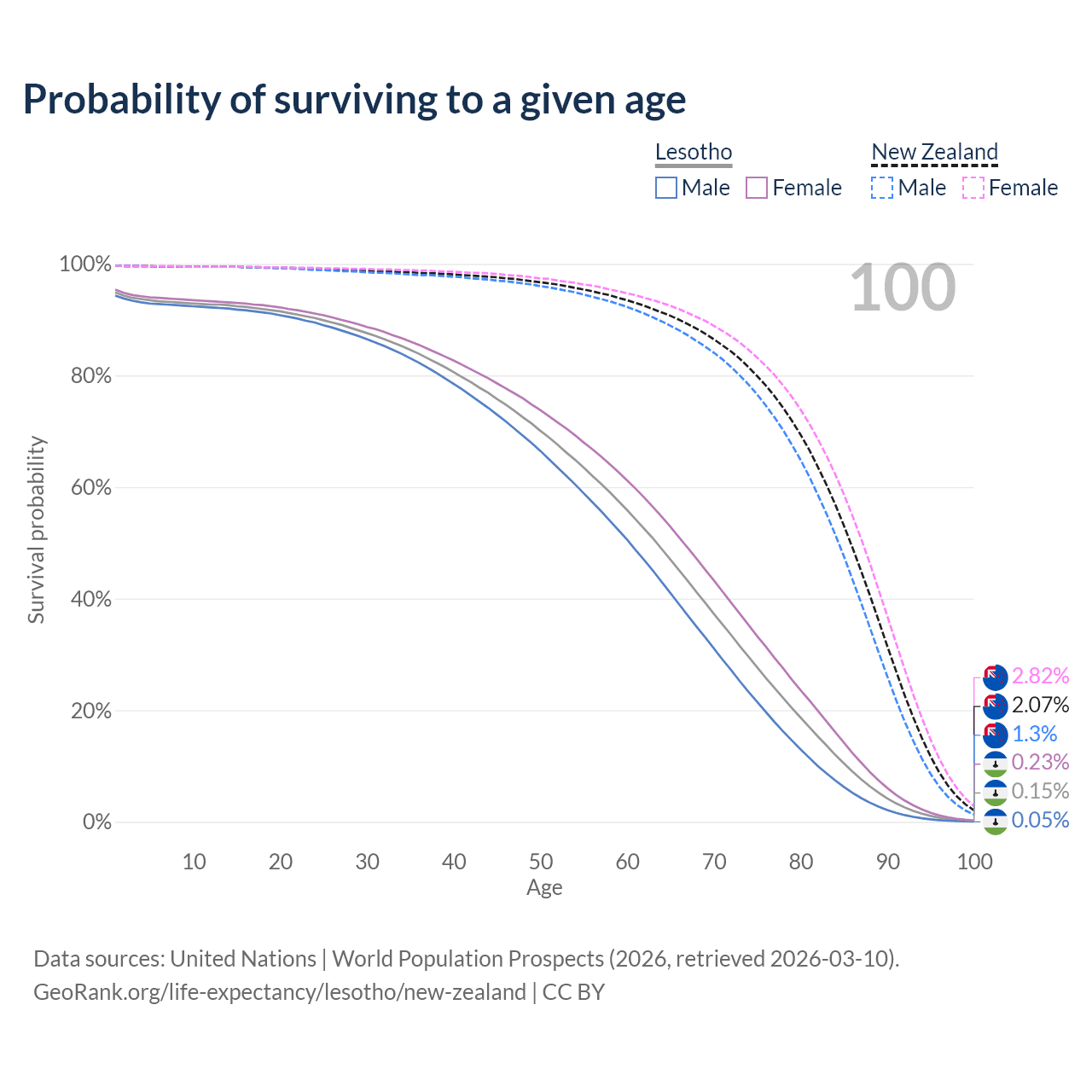 This life expectancy calculator shows the odds of living to 100, 95, 90, and below based on current age for both males and females in Lesotho and New Zealand, along with mean and median age of death. The calculations are based on the 2026 life tables (actuarial tables) from the UN World Population Prospects.