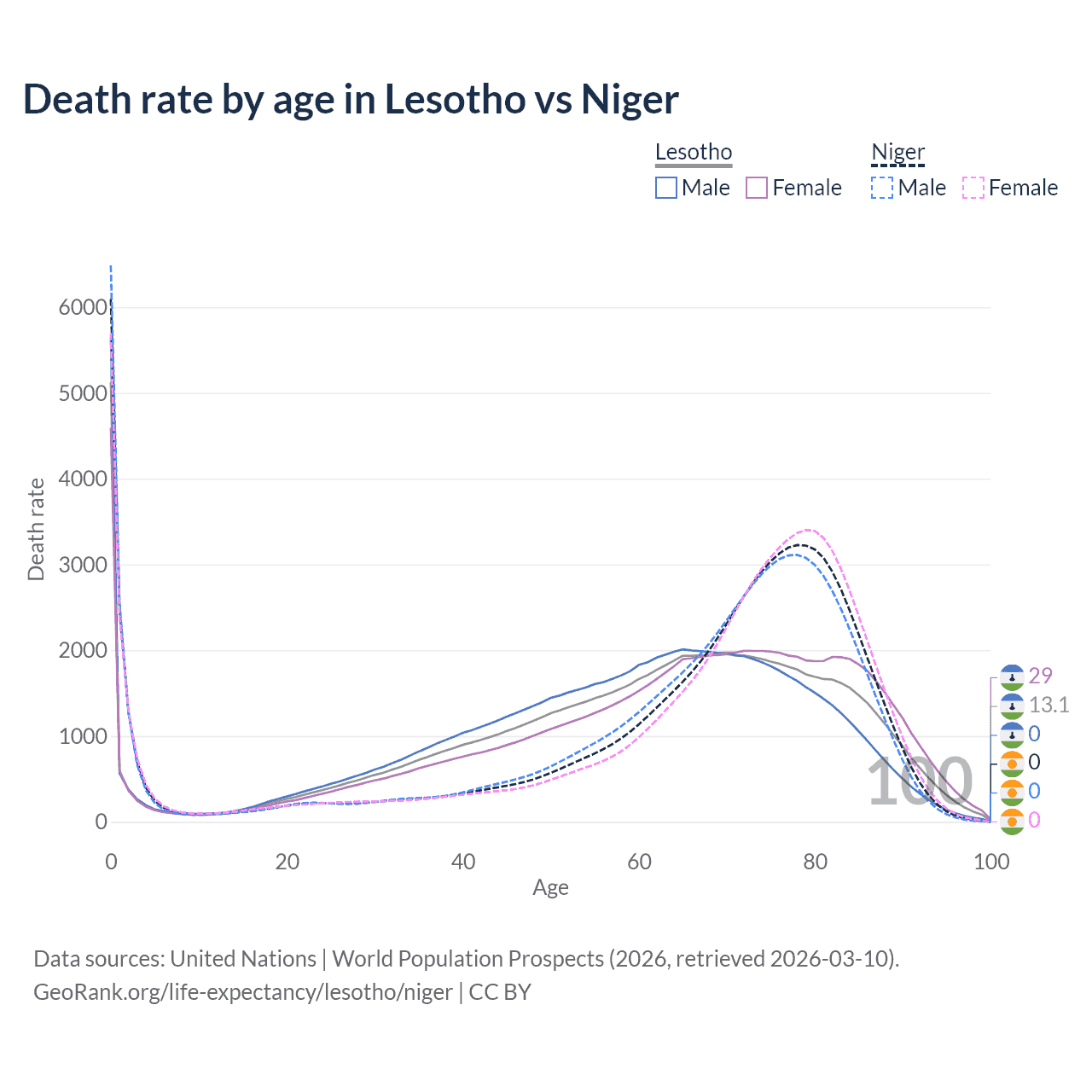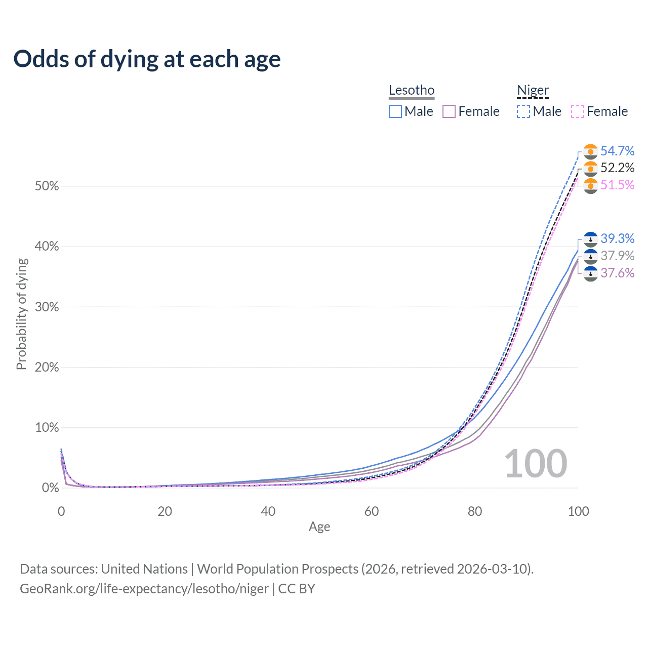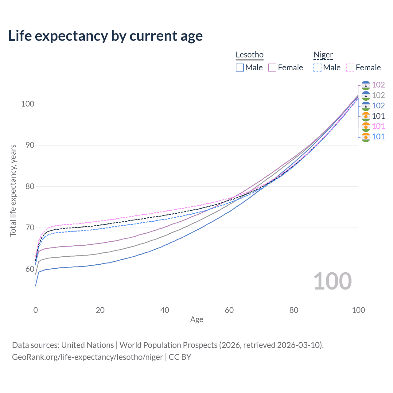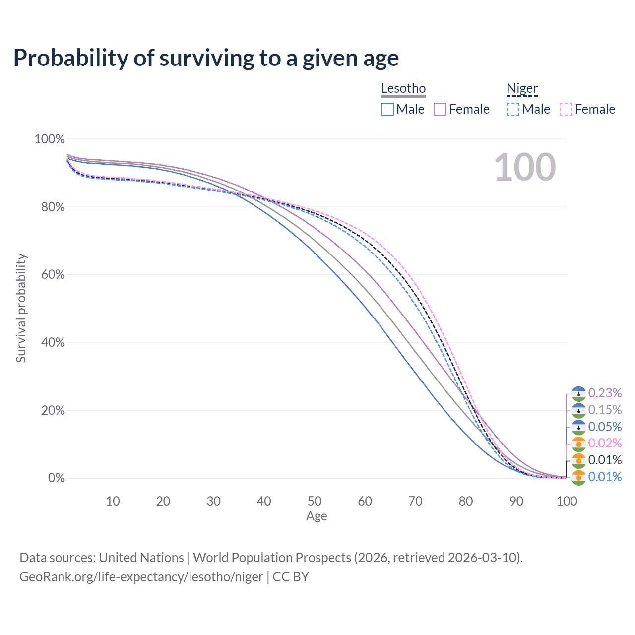 This life expectancy calculator shows the odds of living to 100, 95, 90, and below based on current age for both males and females in Lesotho and Niger, along with mean and median age of death. The calculations are based on the 2026 life tables (actuarial tables) from the UN World Population Prospects.