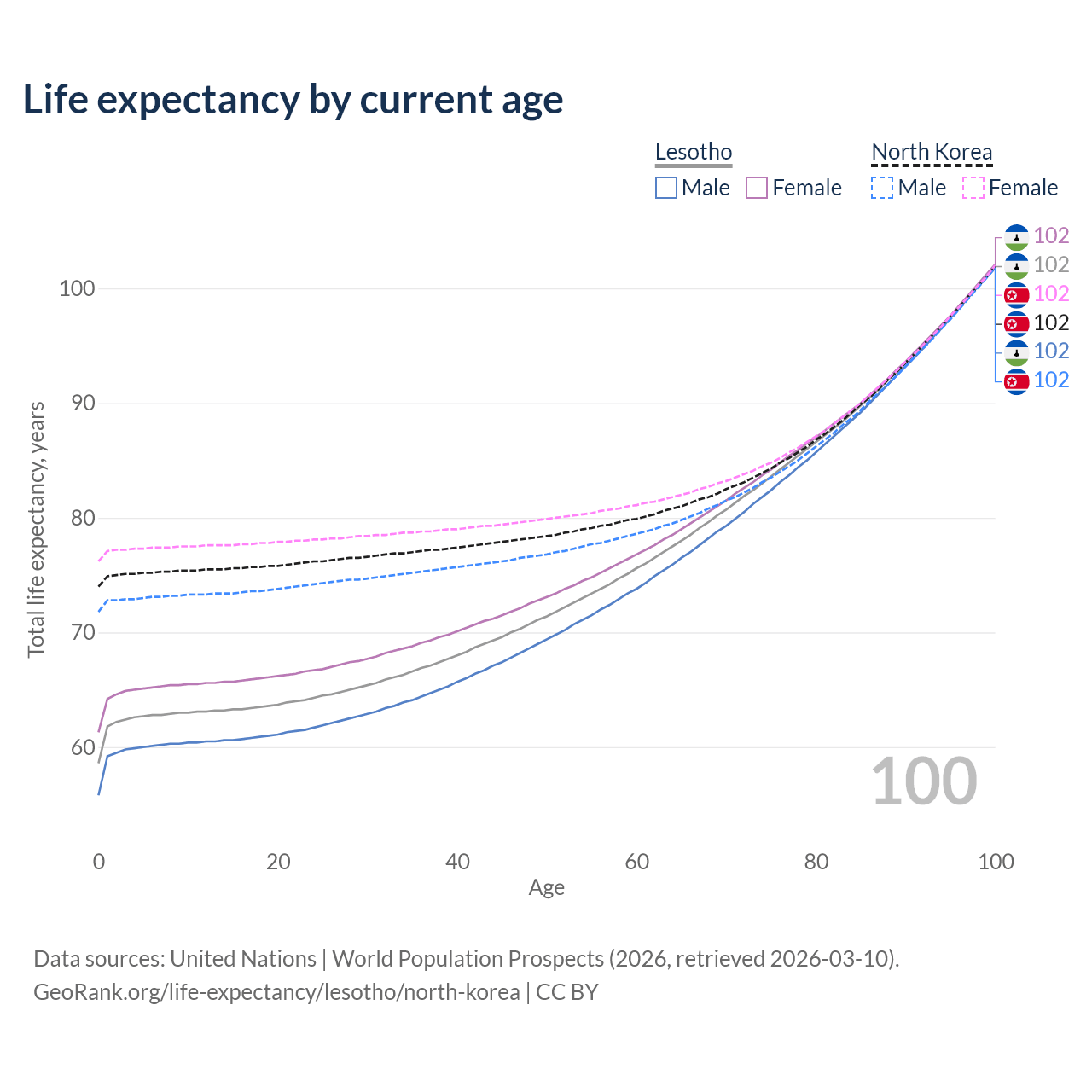 This life expectancy calculator shows the odds of living to 100, 95, 90, and below based on current age for both males and females in Lesotho and North Korea, along with mean and median age of death. The calculations are based on the 2026 life tables (actuarial tables) from the UN World Population Prospects.