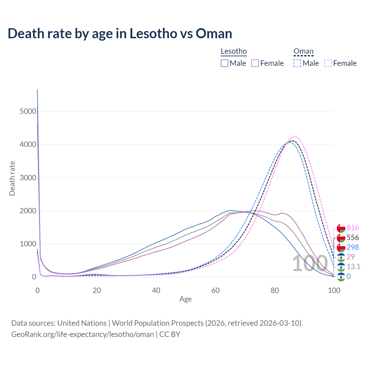 In Lesotho, the most common age of death is 0, compared to 86 in Oman. The median age of death is 63.4 in Lesotho and 83.5 in Oman, meaning only half of each cohort is expected to live past that age.