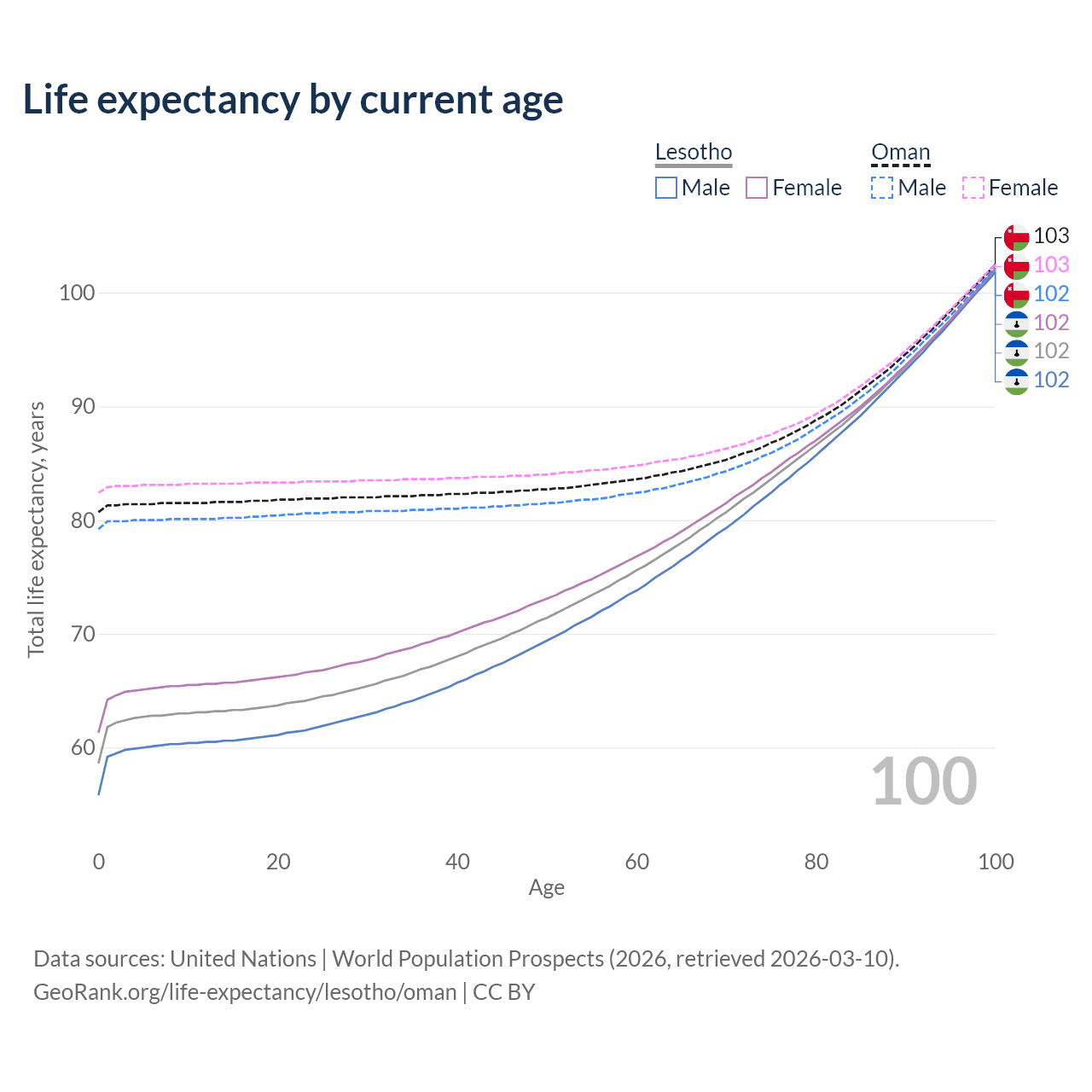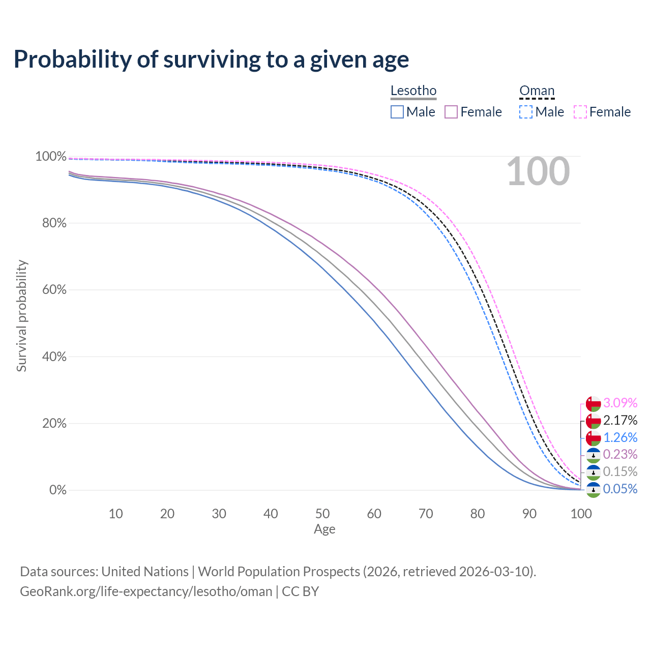 This life expectancy calculator shows the odds of living to 100, 95, 90, and below based on current age for both males and females in Lesotho and Oman, along with mean and median age of death. The calculations are based on the 2026 life tables (actuarial tables) from the UN World Population Prospects.