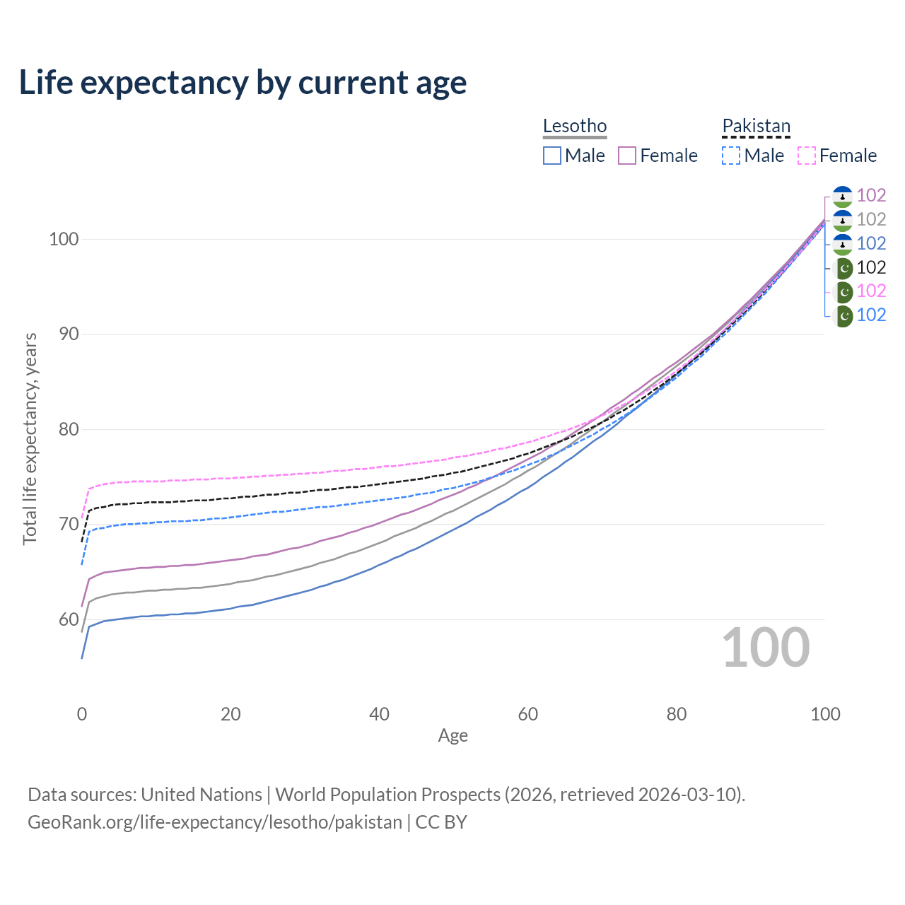 This life expectancy calculator shows the odds of living to 100, 95, 90, and below based on current age for both males and females in Lesotho and Pakistan, along with mean and median age of death. The calculations are based on the 2026 life tables (actuarial tables) from the UN World Population Prospects.