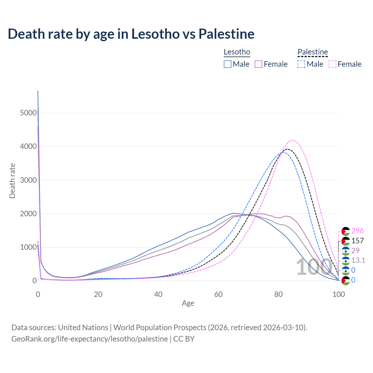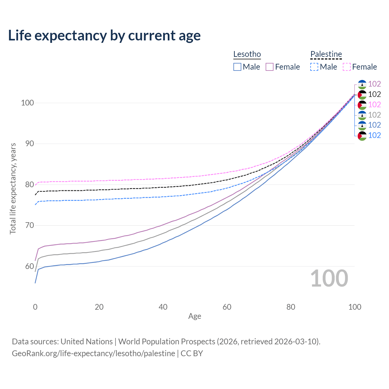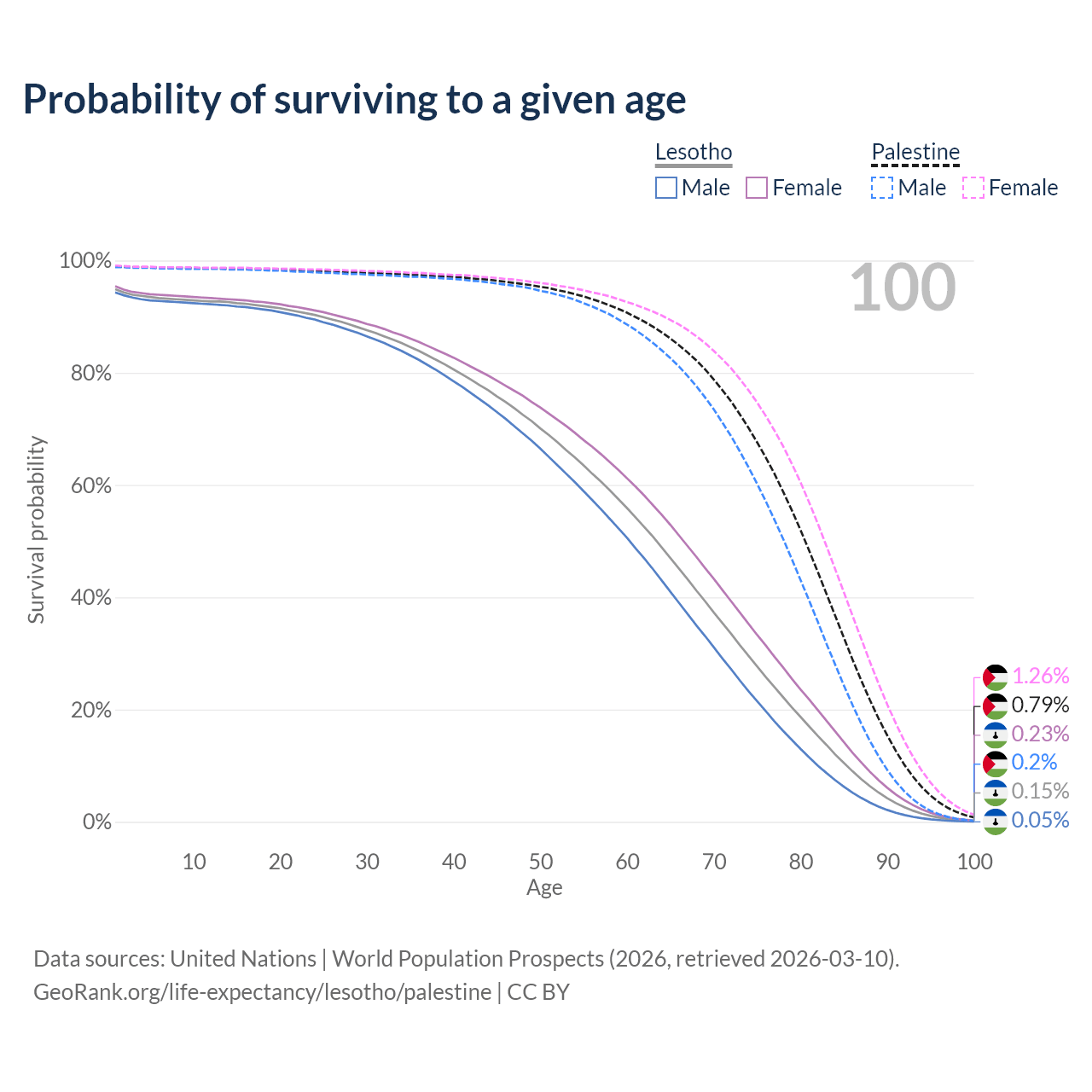This life expectancy calculator shows the odds of living to 100, 95, 90, and below based on current age for both males and females in Lesotho and Palestine, along with mean and median age of death. The calculations are based on the 2026 life tables (actuarial tables) from the UN World Population Prospects.