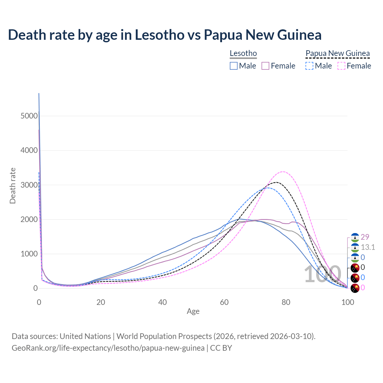 In Lesotho, the most common age of death is 0, compared to 0 in Papua New Guinea. The median age of death is 63.4 in Lesotho and 71.7 in Papua New Guinea, meaning only half of each cohort is expected to live past that age.
