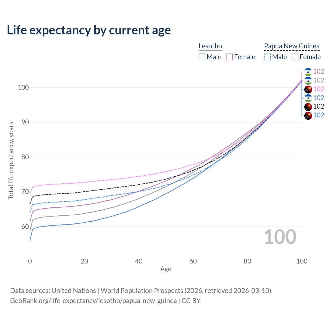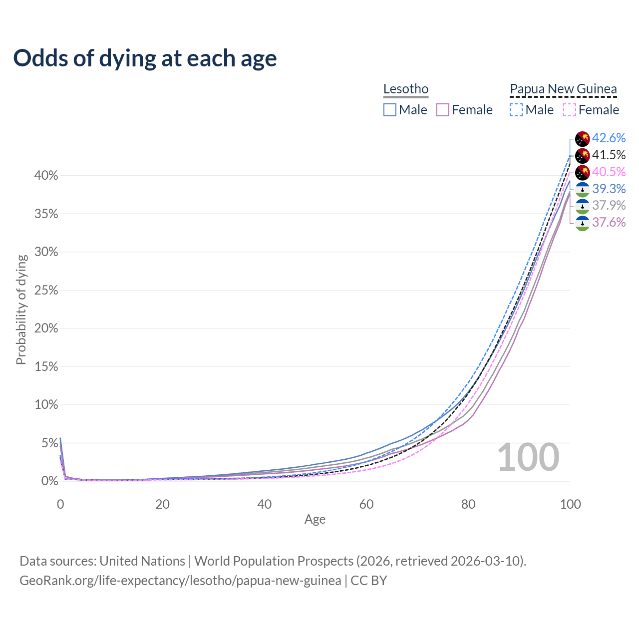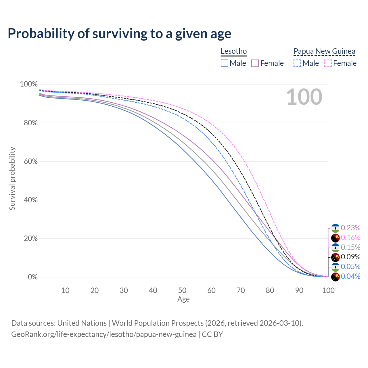 This life expectancy calculator shows the odds of living to 100, 95, 90, and below based on current age for both males and females in Lesotho and Papua New Guinea, along with mean and median age of death. The calculations are based on the 2026 life tables (actuarial tables) from the UN World Population Prospects.