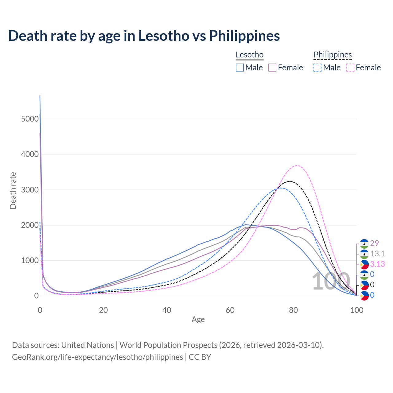 In Lesotho, the most common age of death is 0, compared to 79 in the Philippines. The median age of death is 63.4 in Lesotho and 74.6 in the Philippines, meaning only half of each cohort is expected to live past that age.
