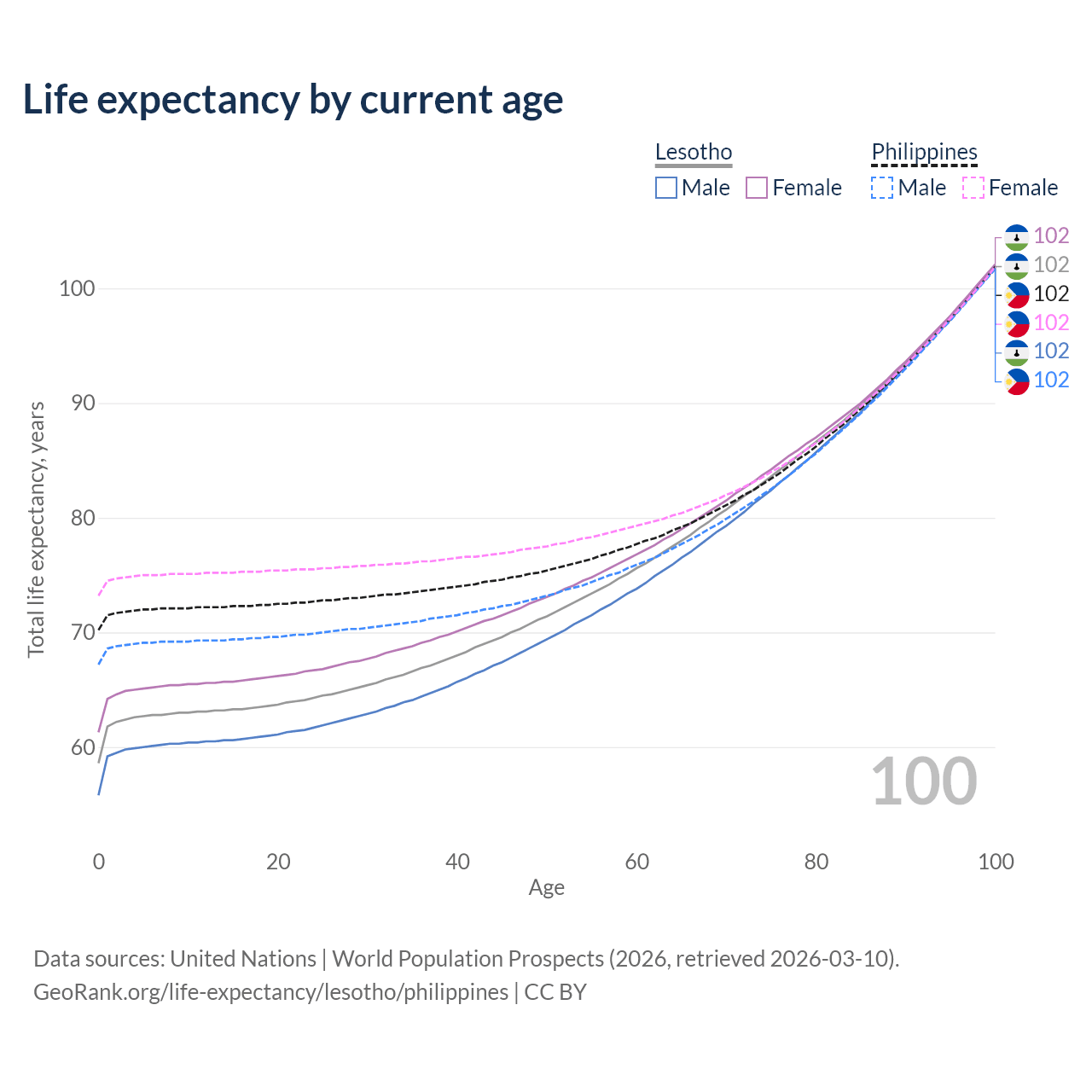 This life expectancy calculator shows the odds of living to 100, 95, 90, and below based on current age for both males and females in Lesotho and the Philippines, along with mean and median age of death. The calculations are based on the 2026 life tables (actuarial tables) from the UN World Population Prospects.
