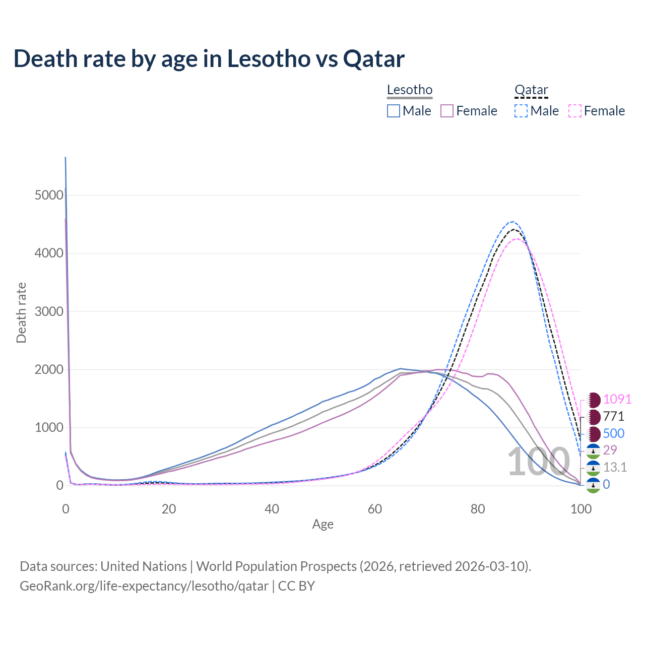 In Lesotho, the most common age of death is 0, compared to 87 in Qatar. The median age of death is 63.4 in Lesotho and 85.1 in Qatar, meaning only half of each cohort is expected to live past that age.