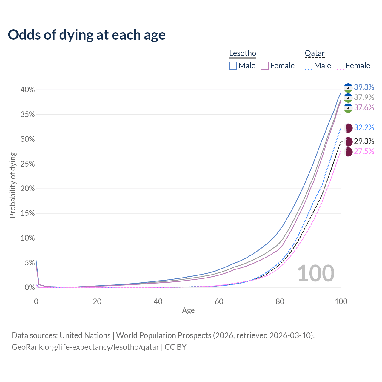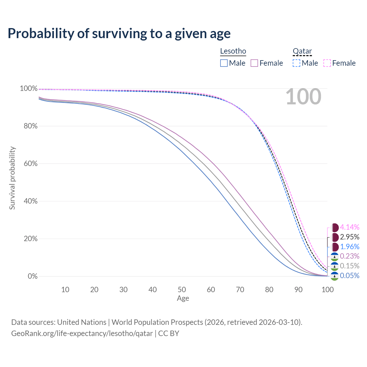 This life expectancy calculator shows the odds of living to 100, 95, 90, and below based on current age for both males and females in Lesotho and Qatar, along with mean and median age of death. The calculations are based on the 2026 life tables (actuarial tables) from the UN World Population Prospects.