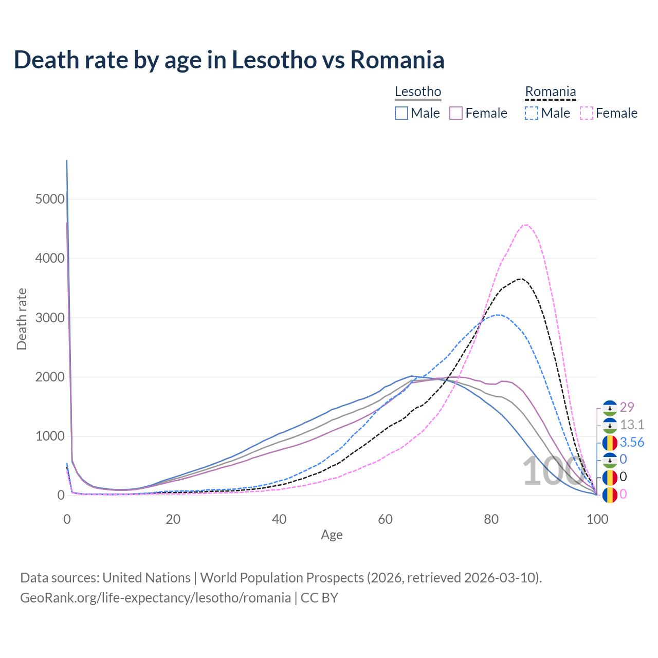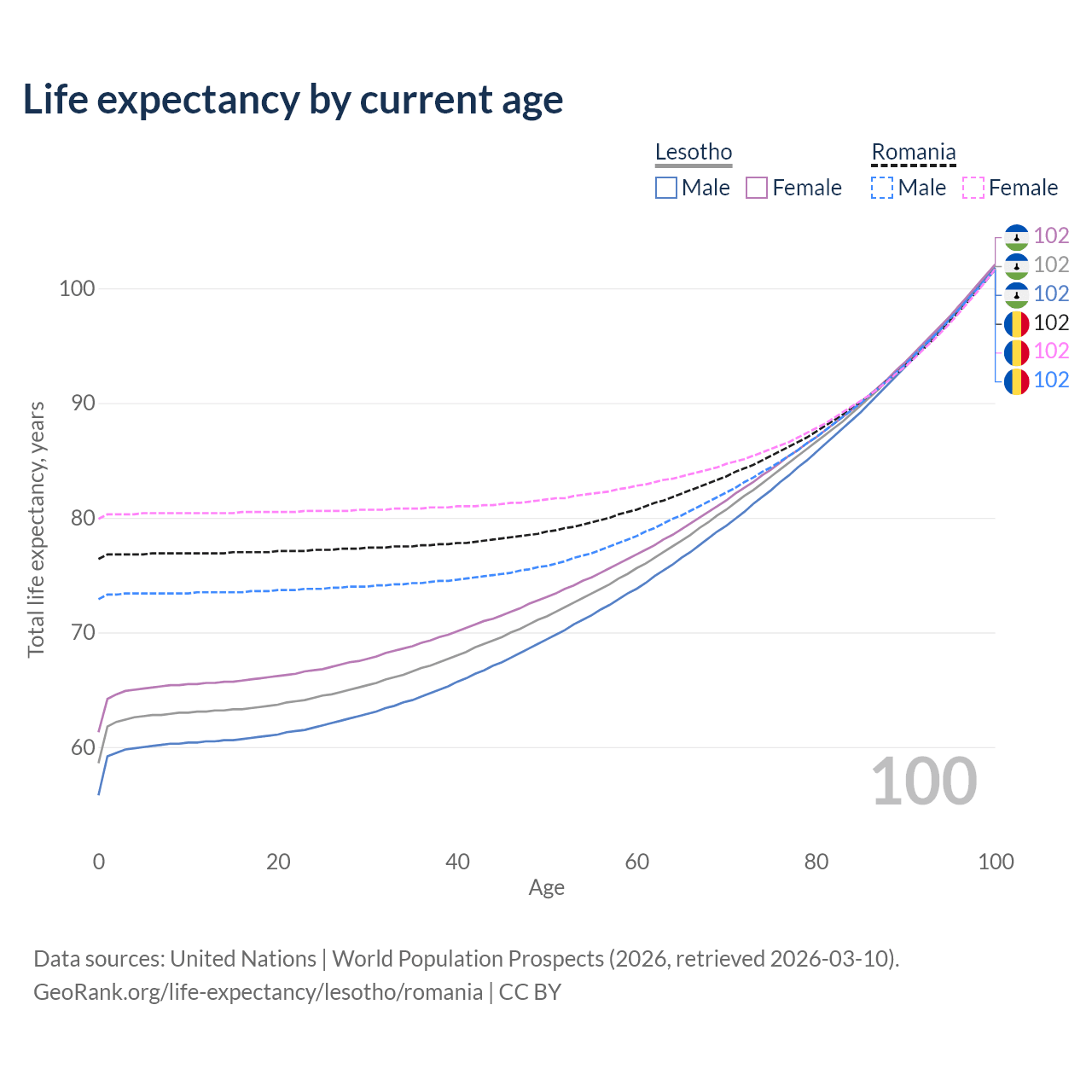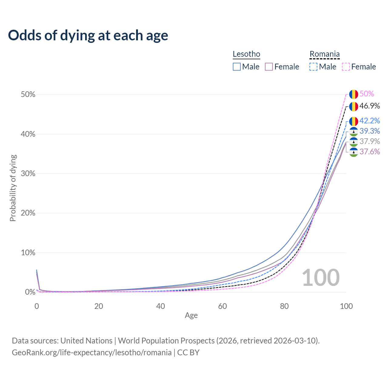 This life expectancy calculator shows the odds of living to 100, 95, 90, and below based on current age for both males and females in Lesotho and Romania, along with mean and median age of death. The calculations are based on the 2026 life tables (actuarial tables) from the UN World Population Prospects.