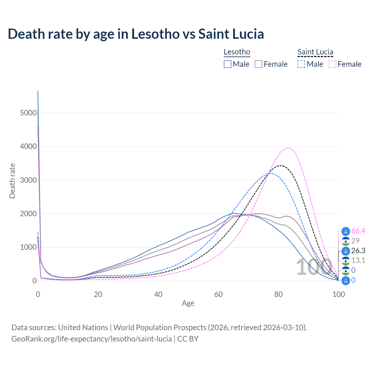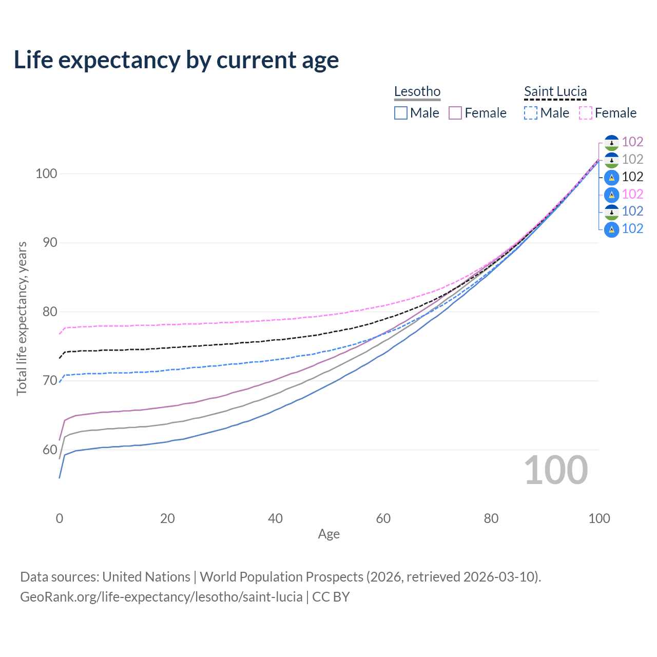 This life expectancy calculator shows the odds of living to 100, 95, 90, and below based on current age for both males and females in Lesotho and Saint Lucia, along with mean and median age of death. The calculations are based on the 2026 life tables (actuarial tables) from the UN World Population Prospects.