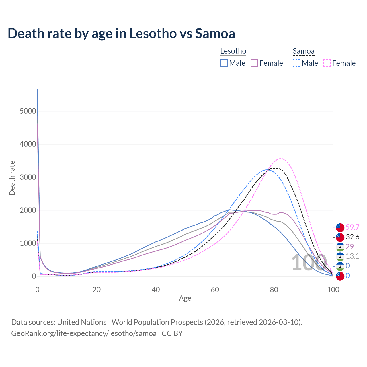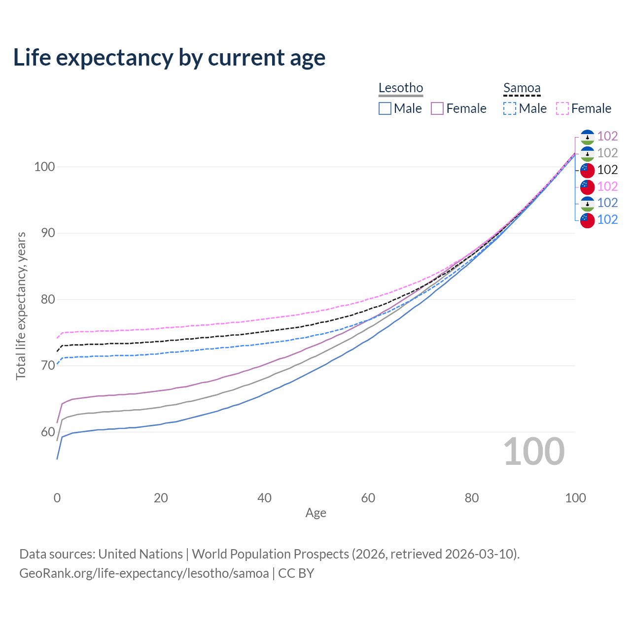 This life expectancy calculator shows the odds of living to 100, 95, 90, and below based on current age for both males and females in Lesotho and Samoa, along with mean and median age of death. The calculations are based on the 2026 life tables (actuarial tables) from the UN World Population Prospects.