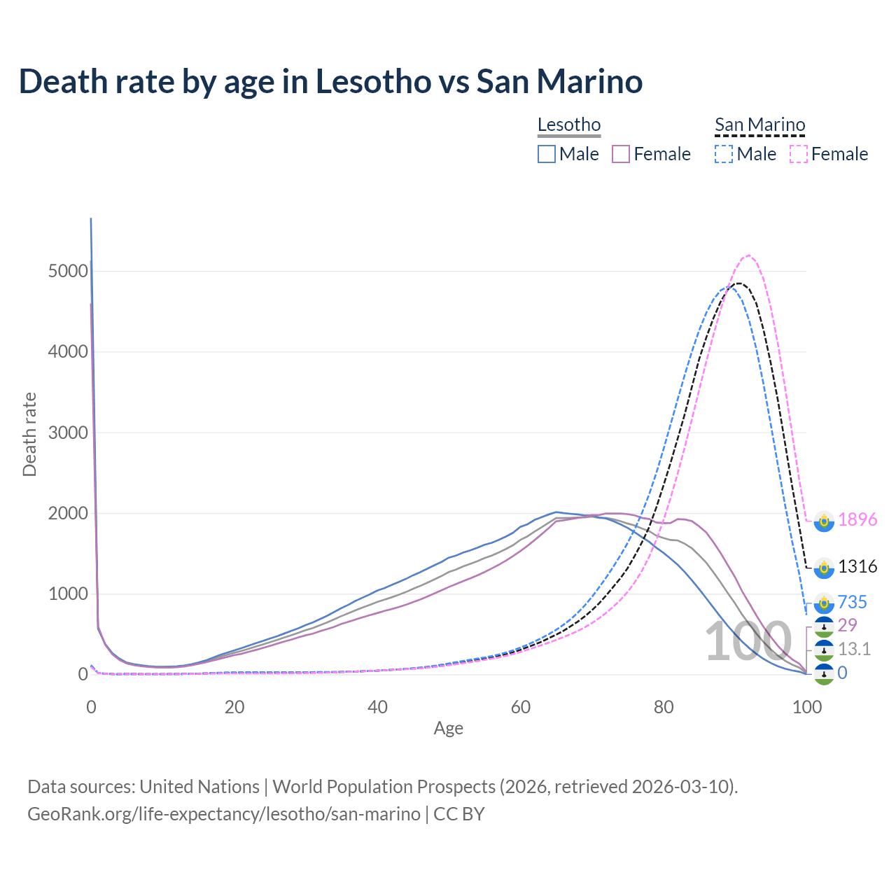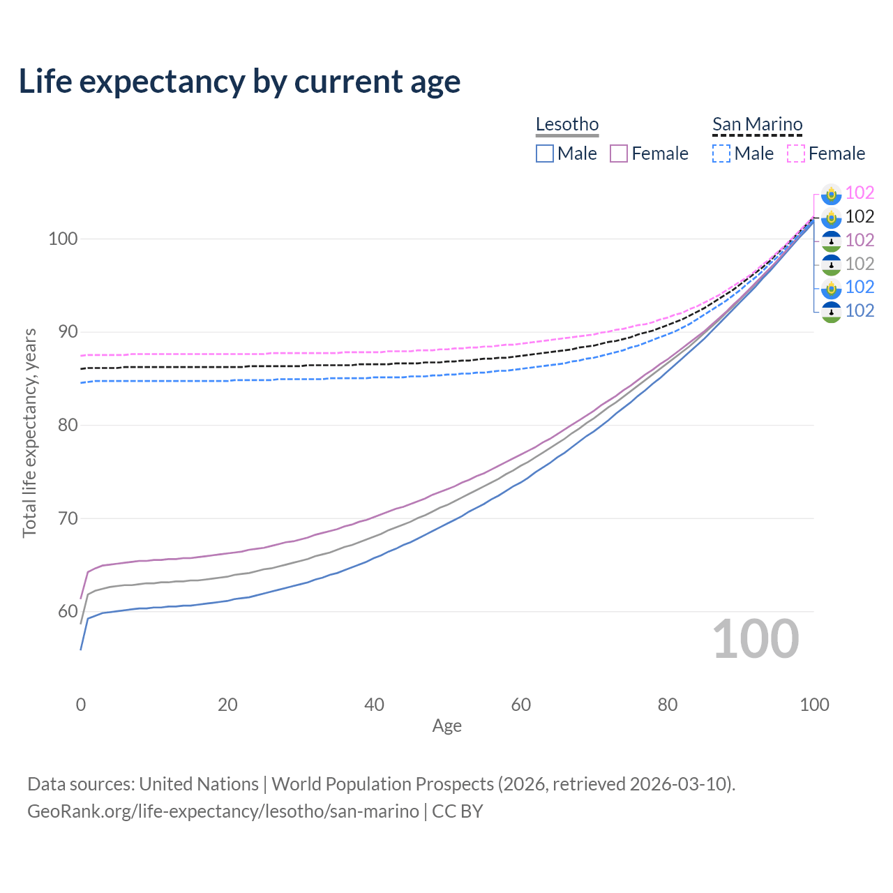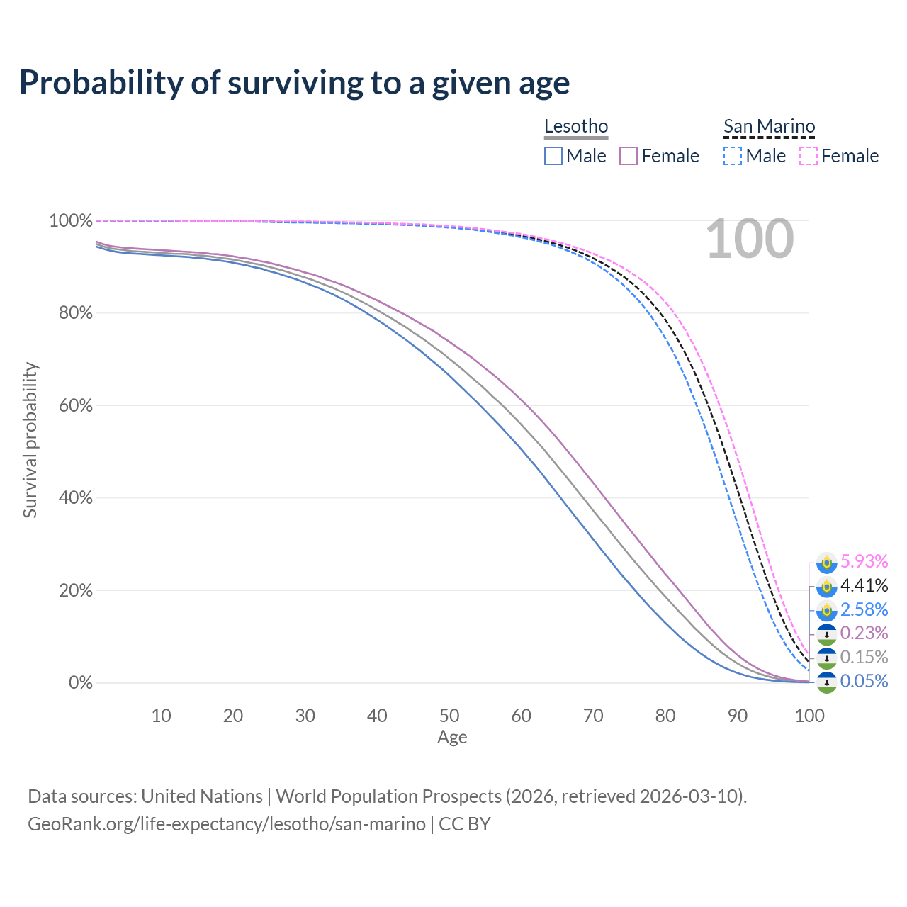 This life expectancy calculator shows the odds of living to 100, 95, 90, and below based on current age for both males and females in Lesotho and San Marino, along with mean and median age of death. The calculations are based on the 2026 life tables (actuarial tables) from the UN World Population Prospects.