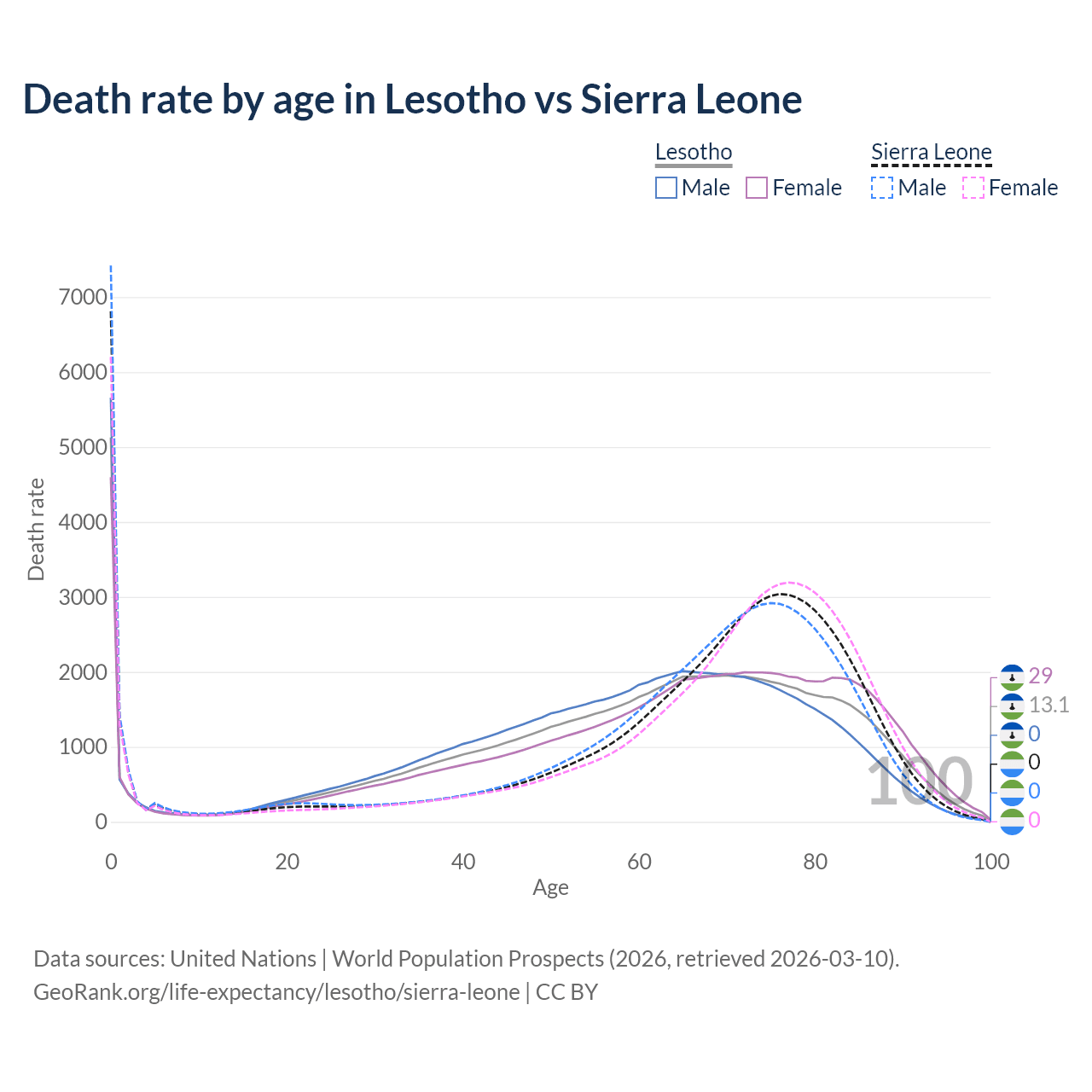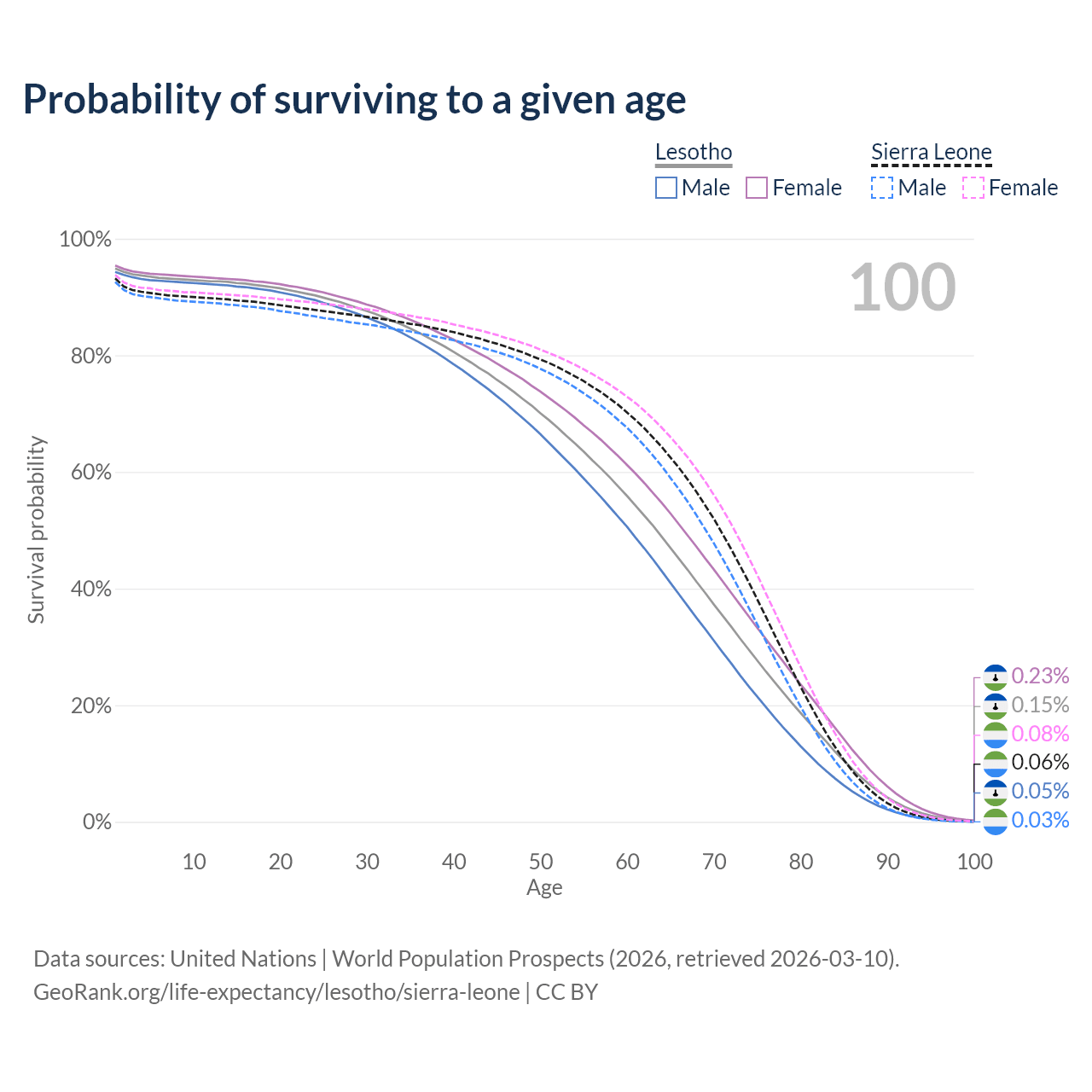 This life expectancy calculator shows the odds of living to 100, 95, 90, and below based on current age for both males and females in Lesotho and Sierra Leone, along with mean and median age of death. The calculations are based on the 2026 life tables (actuarial tables) from the UN World Population Prospects.