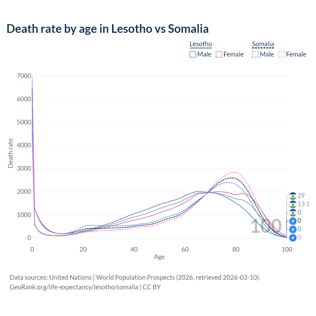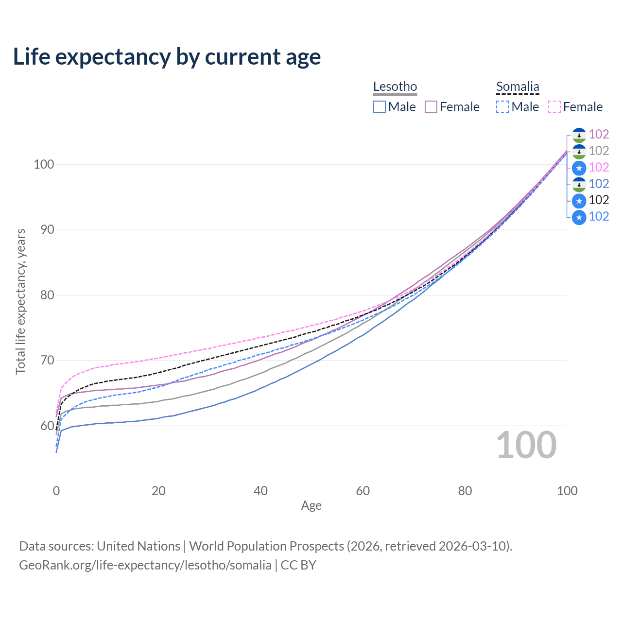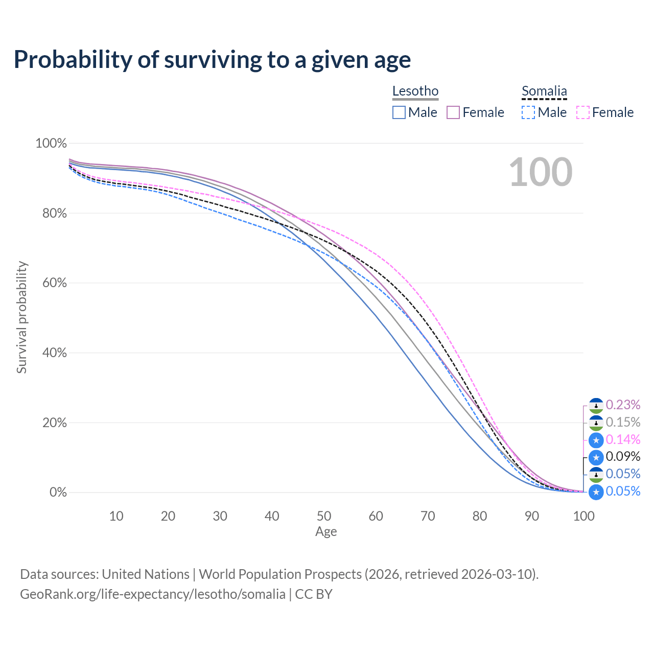 This life expectancy calculator shows the odds of living to 100, 95, 90, and below based on current age for both males and females in Lesotho and Somalia, along with mean and median age of death. The calculations are based on the 2026 life tables (actuarial tables) from the UN World Population Prospects.