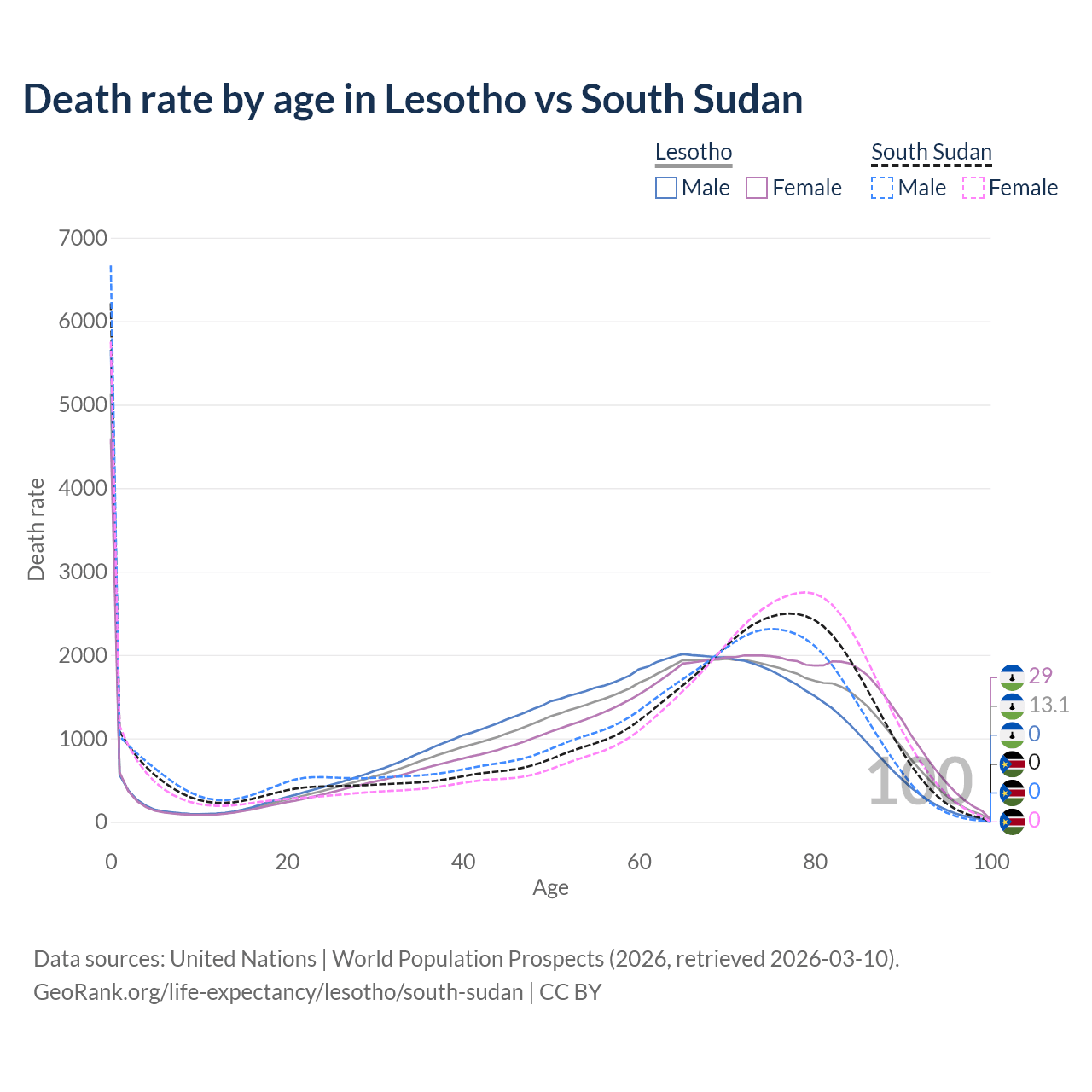 In Lesotho, the most common age of death is 0, compared to 0 in South Sudan. The median age of death is 63.4 in Lesotho and 67.5 in South Sudan, meaning only half of each cohort is expected to live past that age.